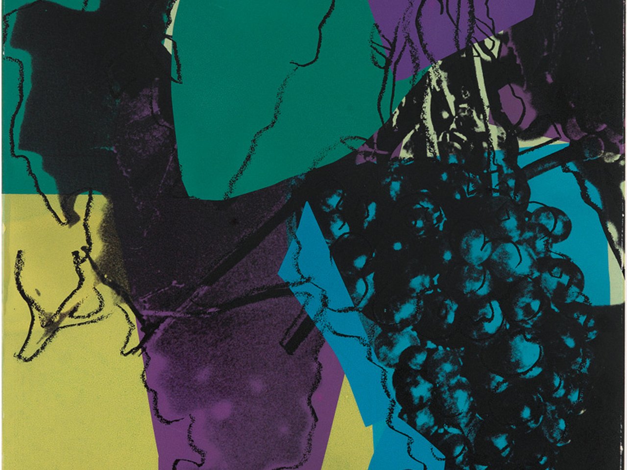 Warhol's repeated use of floral still life in printmaking dates back to around 1961, when he produced one of his characteristic blotted-line ink drawings of a basket filled with Mexican flowers, over which he hand-stamped watercolor petals on the flowers, to secure an illustration commission from Vogue magazine. With his meteoric rise to international artistic popularity in the early 1960s Warhol made one floral still life edition after another: Flowers , offset color lithograph, 1964, created to announce his exhibition at Leo Castelli Gallery, New York (see lots 149 and 152); the Flowers suite of 10 color screenprints, 1970; and the Flowers series of 10 black and white screenprints, 1974, each with unique hand coloring in watercolor; culminating in this series of Grapes , 1979, a suite of six differently arranged bunches of grapes, branches and leaves overlayed with the artist's signature blocks of color and dark black contour lines.