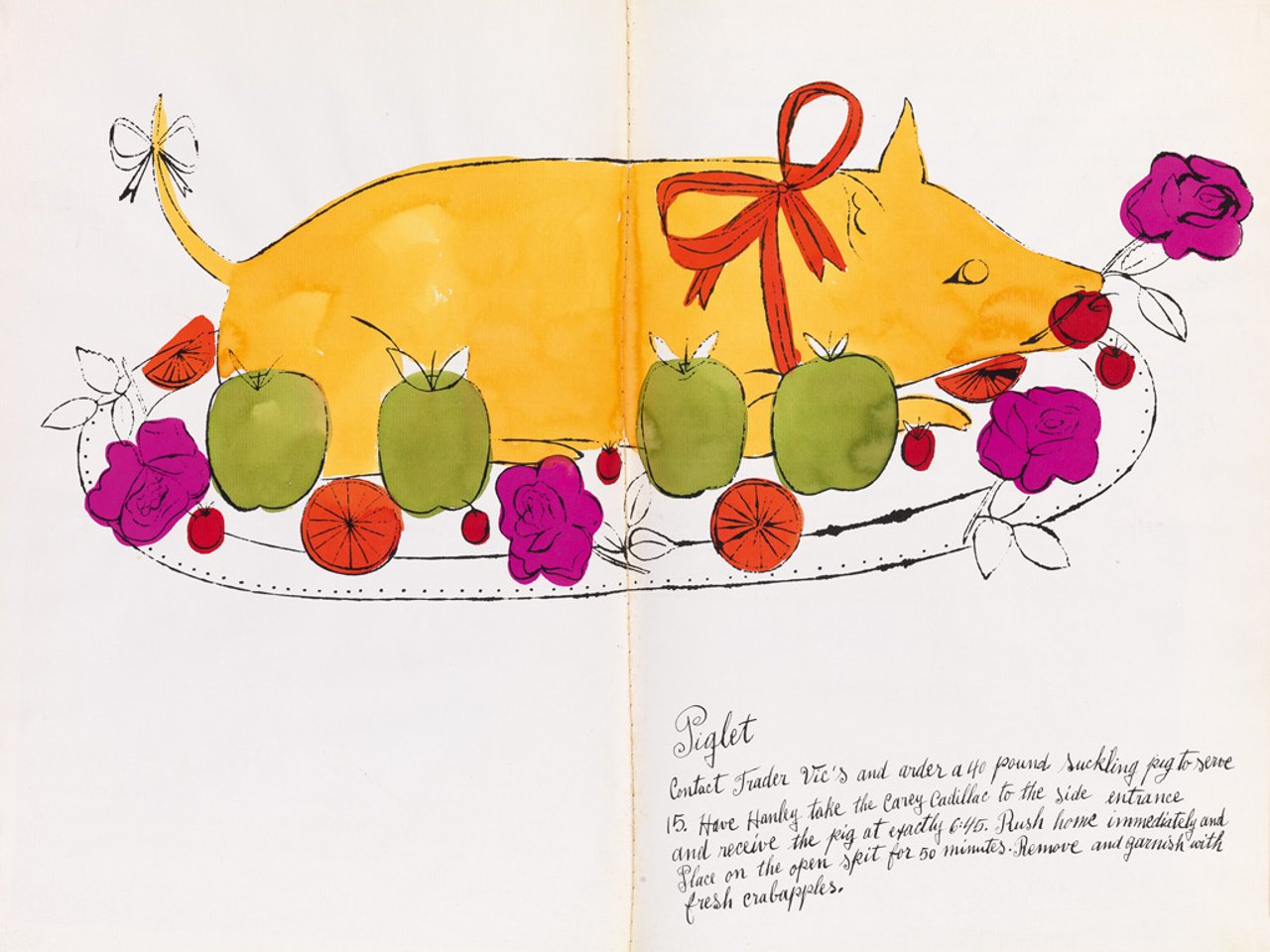 Volume with complete text and 21 offset lithographs, including dupilcate plates of "Calves Head Giant/Stewed Cepes for Richard Rogers Wife" and "Dorothy Killgallen's Gateaux of Marzipan," 15 with hand coloring in watercolor (1 double-page), 1959. 435x280 mm; 17 1/8x11 inches (sheets), full margins. Signed and dedicated "To Bob" in pen and black ink, upper left front cover. Ex-collection Robert Hungerford, New York. Published by the artist, New York. Very good impressions with strong colors.