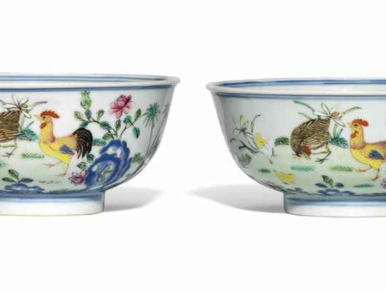 A PAIR OF FAMILLE ROSE 'CHICKEN' BOWLS by Anonymous