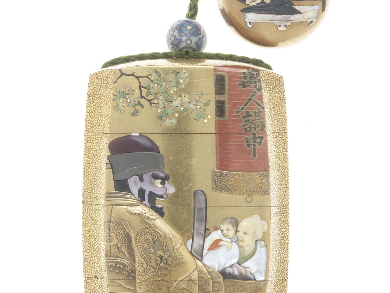 The vertical octagonal-sided body with a kinji ground decorated in gold takamaki-e, e-nashiji, coloured gold hiramaki-e and typical Shibayama inlay with an old woman carrying her grandson on her back in front of a large statue of Enma-o, a large lantern inscribed Man'ninko chu (Buddhist sermon for the masses in progress) suspended above in the right corner, the reverse similarly inlaid with a mother teaching her child how to spin a mawari-toro (rotating cylindrical shadow lantern) showing a silhouette of boar hunters on horseback, the sides, top and base of okibirame, the interior of rich nashiji, unsigned; with a gold-lacquer two-part manju netsuke embellished with flower arrangment in a vase and stalks of cut irises on a tray in the foreground, signed in a red-lacquer rectangular reserve Shibayama and a cloisonné-enamel ojime, unsigned.