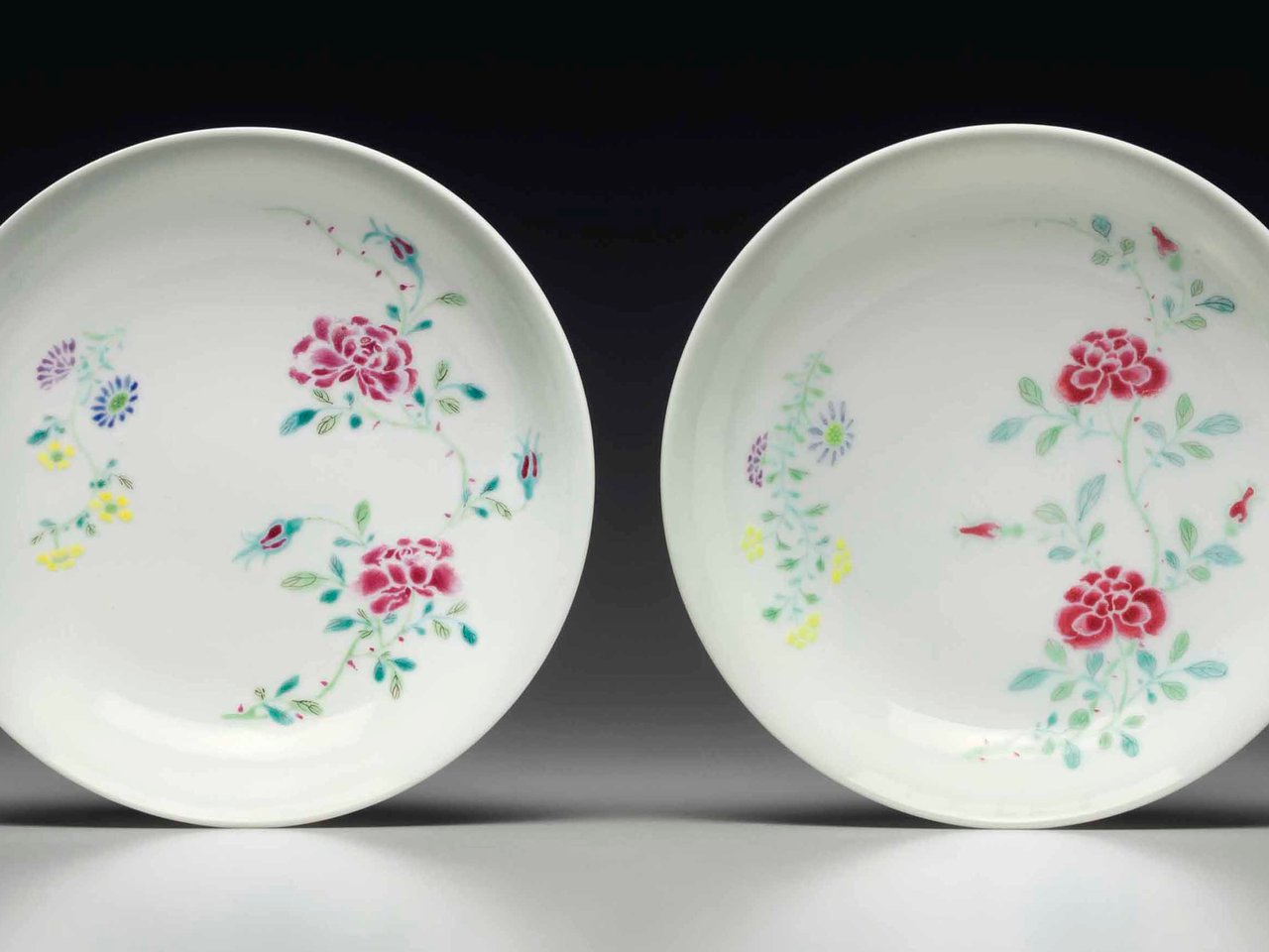 Each dish is delicately enameled on the interior with a blossoming and budding rose branch opposite a slender, leafy stem bearing yellow flowers, and a blue aster.