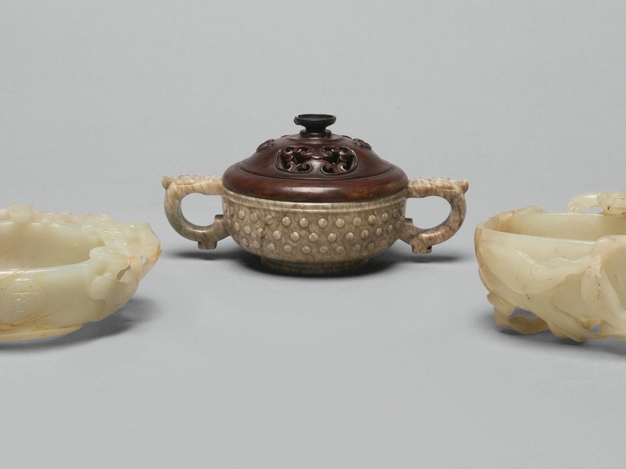 the first a pale celadon jade washer of lychee form, borne on a leafy branch and set with a clambering chilong, wood stand; the second a pale celadon jade washer decorated with three chilong and a shou roundel; the third an archaistic jade cup carved with rows of bosses and flanked by a pair of dragon handles, wood cover (5)