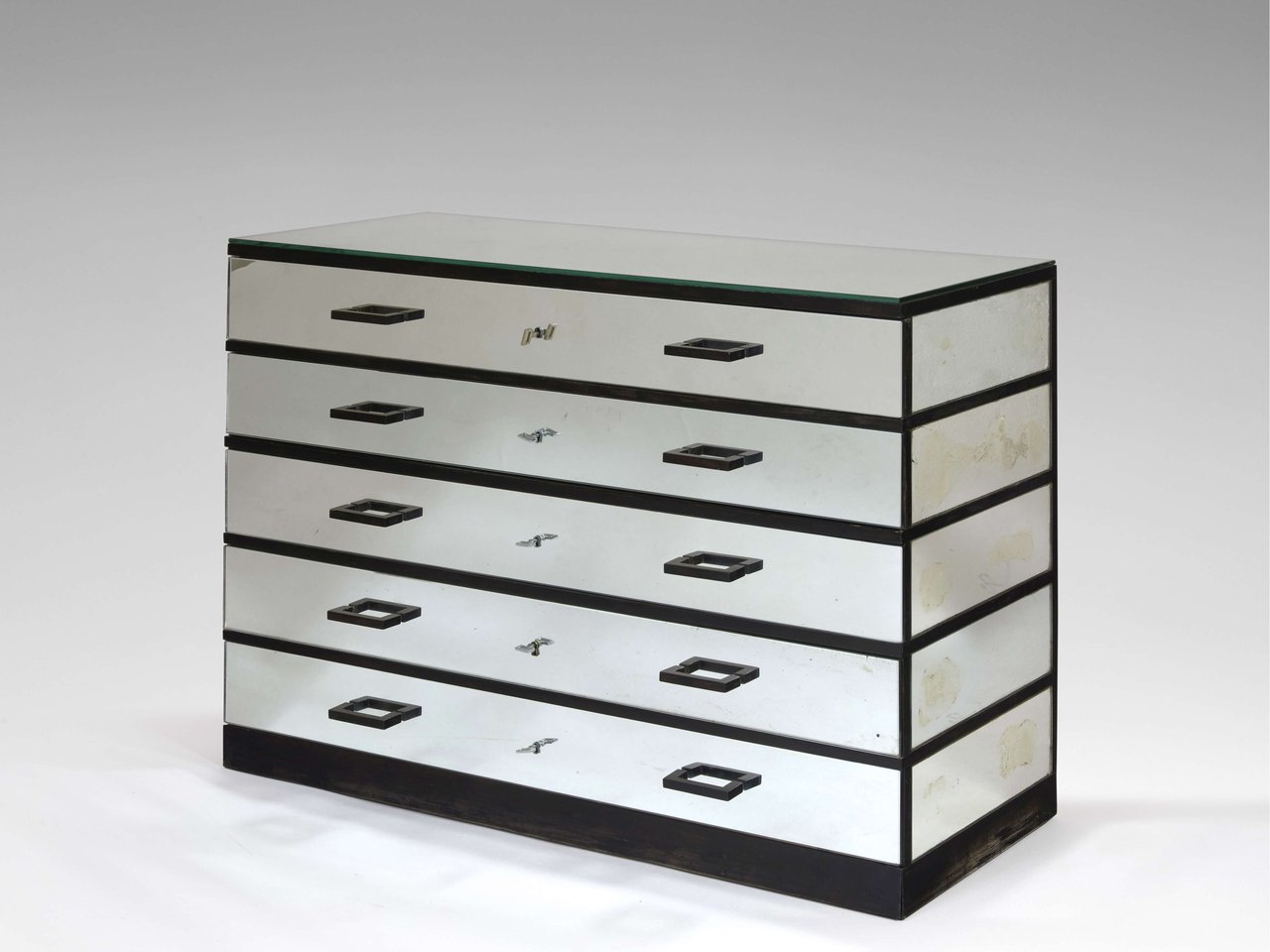 Corps quadrangulaire en bois noirci entièrement plaqué de miroirs ouvrant par cinq tiroirs en façade.