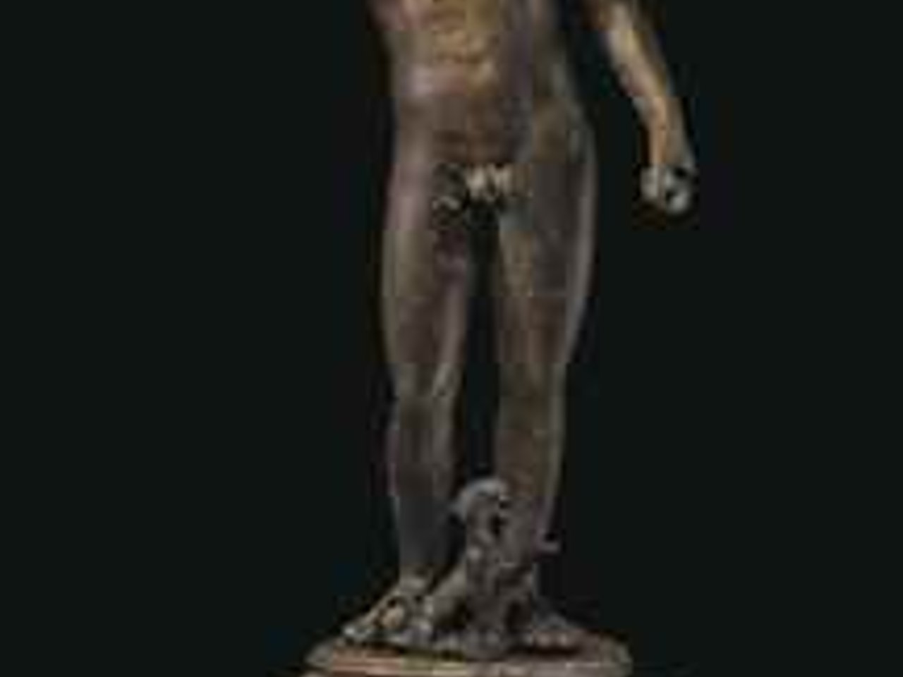 The youthful god depicted nude, standing with his weight on his left leg, the right relaxed and bent at the knee, his left arm lowered, perhaps once holding a kantharos, and his right arm raised, perhaps once holding a cluster of grapes, his fleshy torso with copper inlays for the nipples, his head turned to his right, with a smooth forehead and modeled angular brows merging with the bridge of his nose, the lidded convex eyes inlaid in silver and articulated, his long hair center parted and bound in a copper fillet incised with a scrolling vine, with separately-made wavy tresses falling along his neck and spreading onto his shoulders, atop the original, elaborate, tiered plinth together with a seated panther at his feet, its left forepaw raised, the upper tier of the plinth circular in form with a cyma reversa molding, the lower square, with incised petals on the upper surface, a foliate band on the outer edge, a dog-tooth molding below, the corners supported by down-turned felines, their tails looped, their heads raised