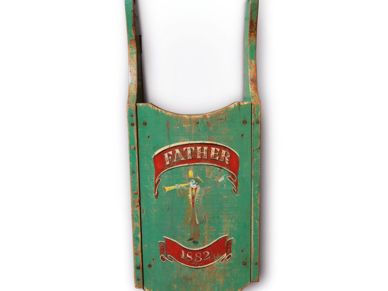 FINE AND RARE CHILD'S GREEN AND POLYCHROME PAINT-DECORATED WOOD SLED WITH FIREMAN BLOWING HIS HORN , 1882