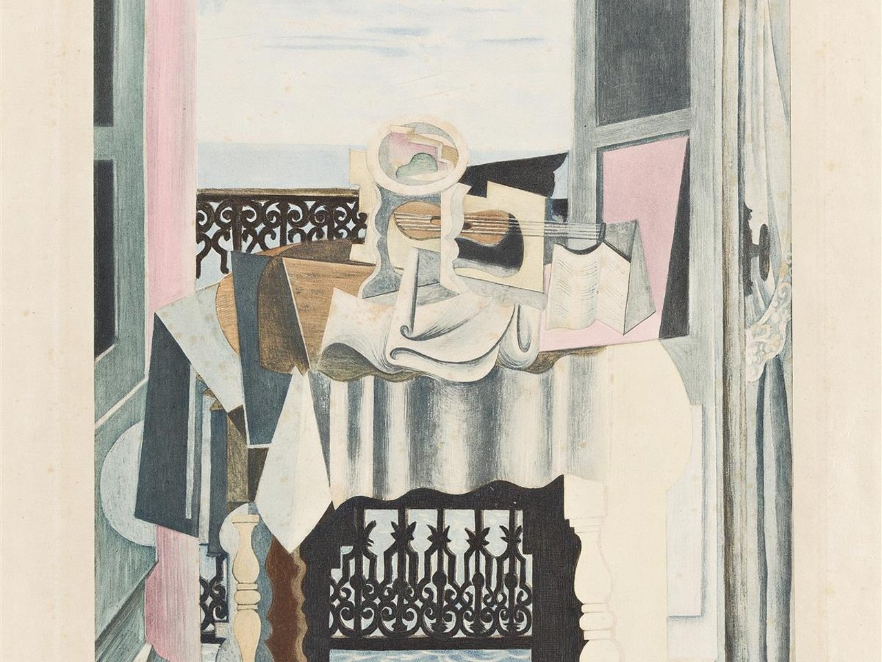 Nature morte devant une Fenêtre à St. Raphael is based on a gouache painting from a series of works Picasso (1881-1973) made during a trip with his then new wife, the Russian ballet dancer, Olga Khokhlova, to Saint-Raphaël, a small town popular with holiday makers situated on the French Riviera between Cannes and Saint Tropez. Here the newly-married couple stayed in the elegant Hôtel Continental et des Bains. Their room and balcony looked out over the sparkling Mediterranean water, and it was this setting that inspired Picasso to begin a series of elegant domestic still-lifes in pencil, gouache and watercolor that featured a table arranged with various objects, placed in front of the open window to the sea beyond.