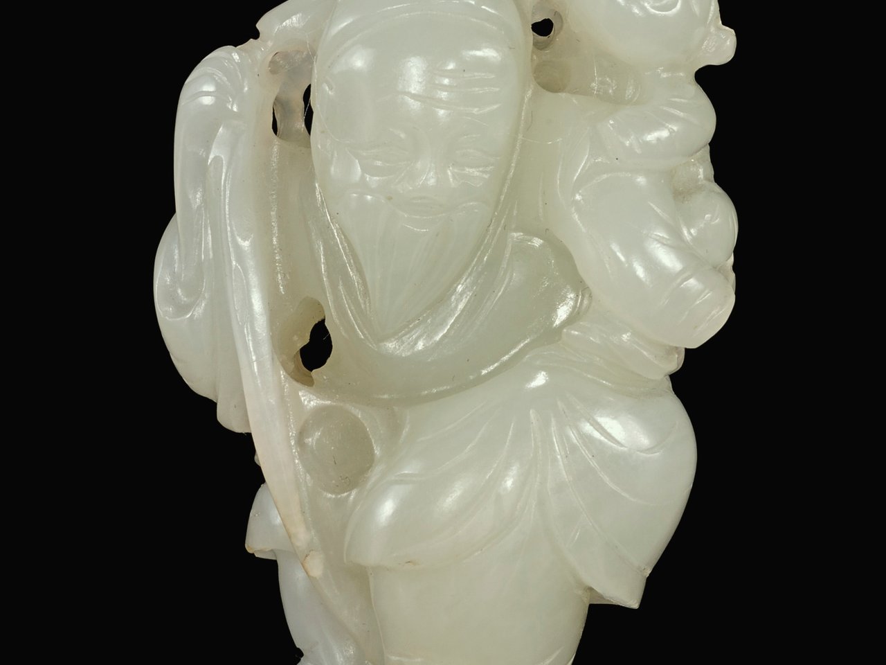 the long-robed standing elder carrying a smiling boy in one hand while holding a lingzhi branch in the other, the stone with some opaque inclusions