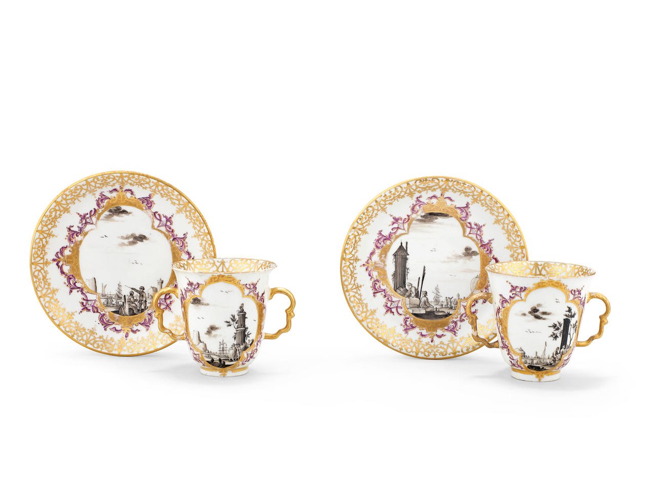 Painted in the manner of C.F. Herold with Kauffahrtei scenes depicting merchants and their wares by a quayside in black monochrome within gilt quatrelobe cartouches embellished with purple scrollwork, gilt scrollwork borders to the rims, crossed swords mark in blue and underglaze-blue, gilt numeral 1. to all (one saucer restuck with restuck rim chip, one handle restored, some minor losses and chips) (4)