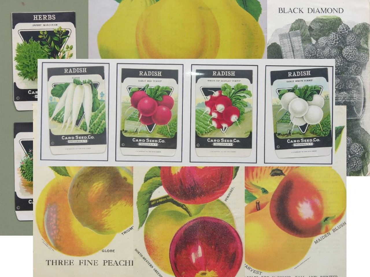 1) Three Fine Peaches: Carman, Triumph, Globe. Color lithograph on paper. Measures 8 ¾"H x 5 ¾"W. With advertistment photocopied on verso. 2) Three Best Quinces: Champion, Orange, Meeches. Color lithograph on paper. Measures 5 ¾"H x 8 ¾"W. With advertistment photocopied on verso. 3) Black Diamond: the Finest Black Rasberry in the World. Measures 8 ¾"H x 5 ¾"W. With advertistment photocopied on verso. 4) Three of the best Winter Apples: Pewaukee, North-Western Greening, Jonathan. Measures 8 ¾"H x 5 ¾"W. With advertistment photocopied on verso. 5) Apples for Summer, Fall and Winter. Rome Beauty, Maiden Blush, Early Harvest. Measures 8 ¾"H x 5 ¾"W. With advertistment photocopied on verso. 6) 4 seed packages for Radishes from Card Seed Co., Fredonia, N.Y. Each measures 5"H x 3 ¼". 7) 2 seed packages for Herbs from Card Seed Co., Fredonia, N.Y. Each measures 5"H x 3 ¼".