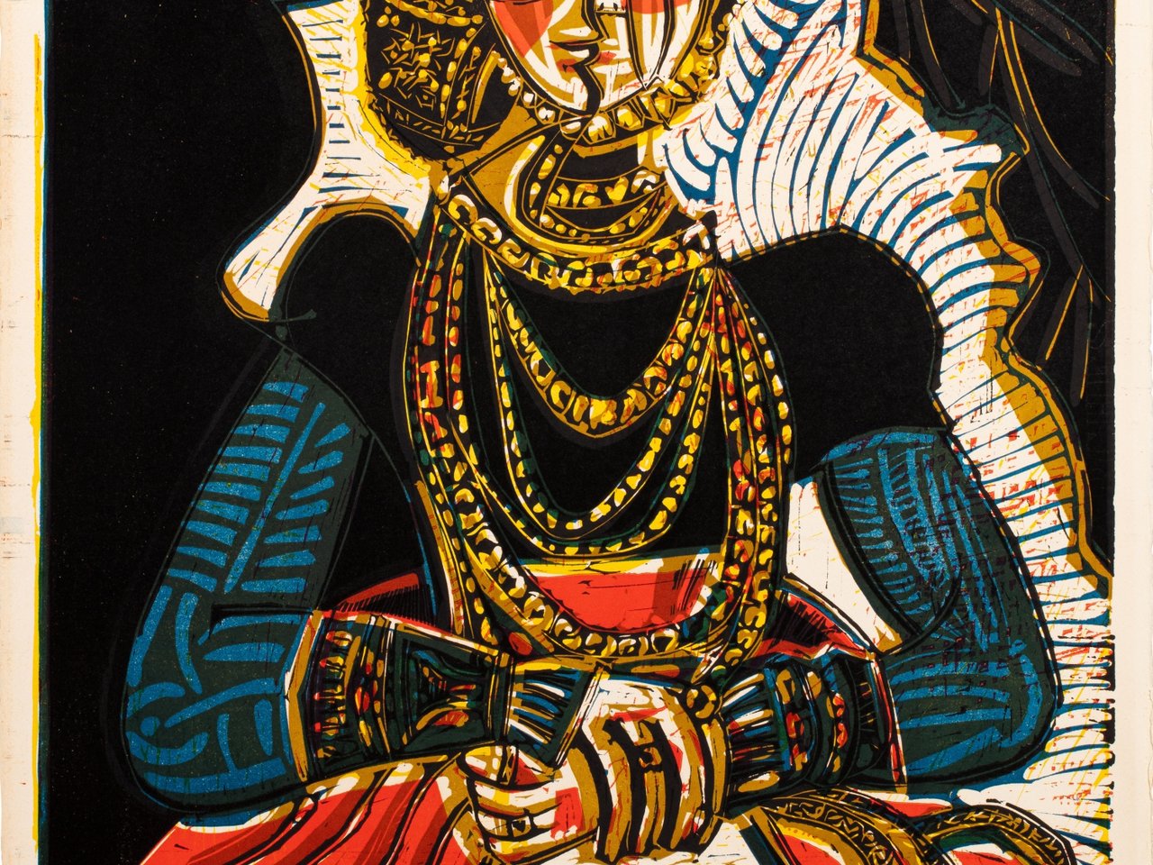 Importante linogravure imprimée en couleurs sur papier vélin Arches, inscrit et dédicacé Pour Werner Son amie Jacqueline au crayon par Jacqueline Roque-Picasso ( verso )