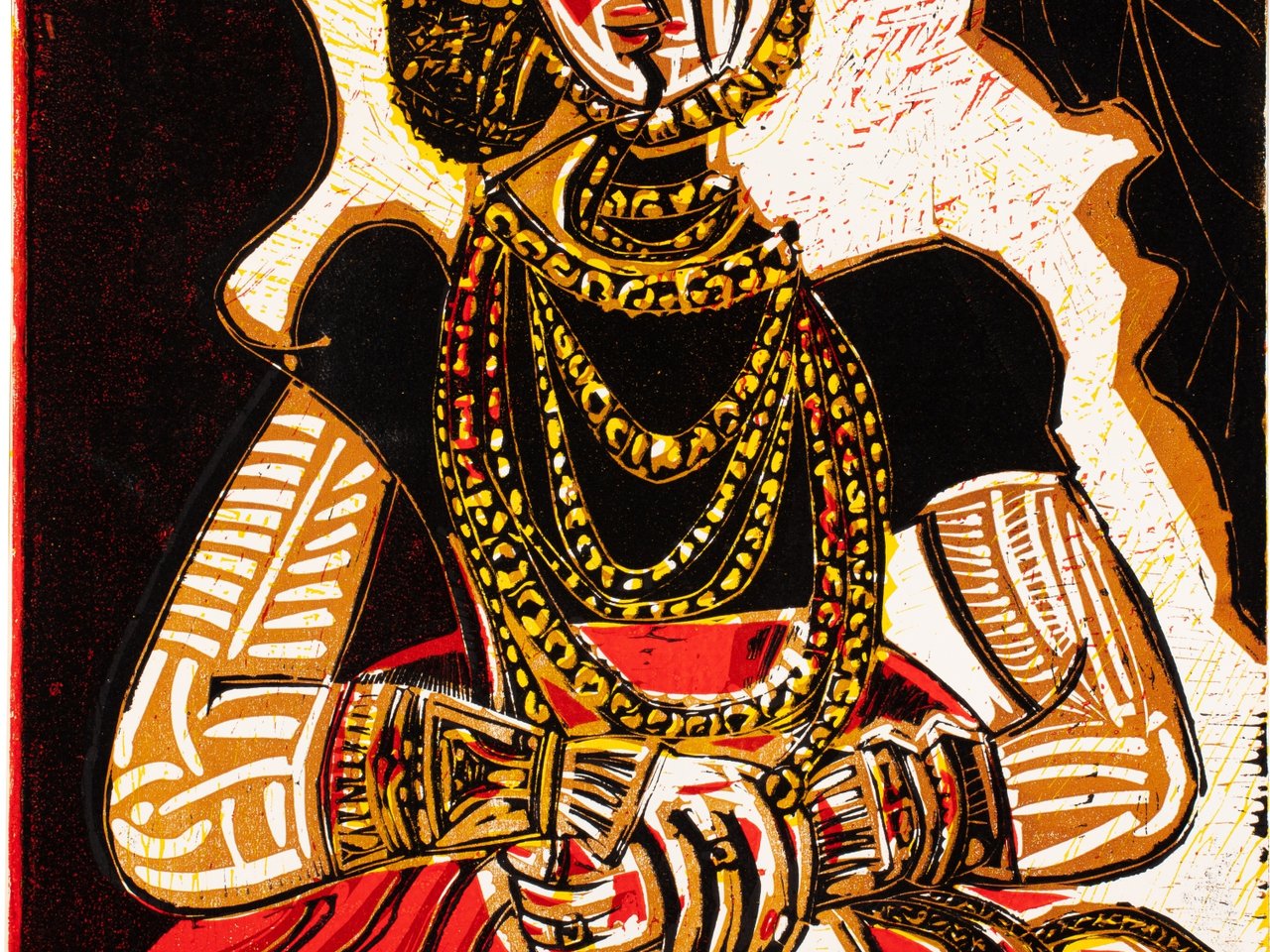 linoleum cut printed in ochre, yellow, red and black on wove paper