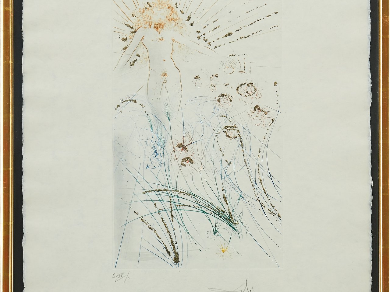 Salvador Dali Spain 1904-1989. "Song of Songs of Solomon": "The Beloved Feeds Among the Lilies". Signed and numbered Dalí S XV/L. Blind stamped LA Dalí. Etching printed in colors on Japanese paper, sprinkled with glitter, 40 x 25 cm (sheet size 67 x 51 cm).