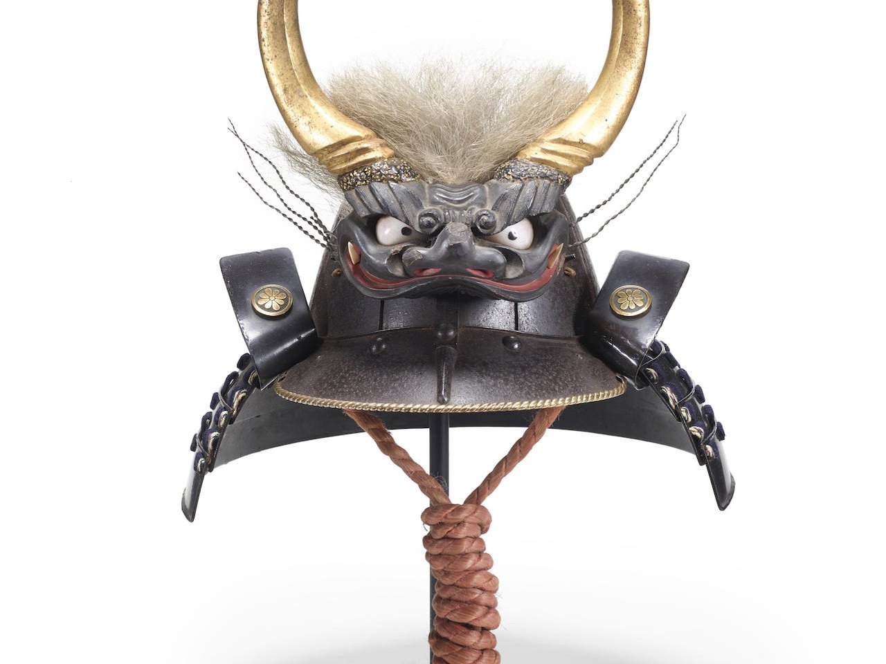 Forged in iron and constructed with eight-vertical plates, each overlapping with the rear edge standing in profile, the surface finished to a rich russet patina, and mounted on the crown with a four-stage gilt and copper tehen kanamono, the mabizashi applied with a gilt-copper "twisted rope" fukurin and a large, bold, long-horned demon maedate of lacquered wood, glass eyes, twisted wire whiskers and a shock of horse hair, the bowl fitted with a four-lame black-lacquer shikoro laced in dark blue and finishing in long narrow fukigaeshi applied with gilt-metal heraldic crests of flower heads enclosed within circles, the bowl inscribed Gitsu