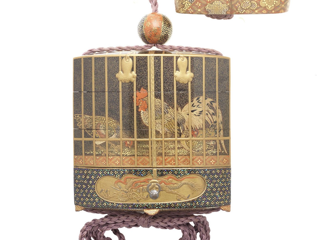 The wide rounded-rectangular body embellished in gold and coloured takamaki-e, hiramaki-e, e-nashiji and kirikane with details inlaid in shell with a cockerel and two hens behind the vertical bars on one side and three pheasants on the other, both above a writhing dragon within a irregularly shaped panel, the interior of nashiji, the bottom of rich gyobu nashiji and signed in a gold-lacquer rectangular reserve Shunsho with seal Shun; with en-suite lacquer hako netsuke in the form of toy cat lacquered with cherry blossoms, maple leaves and chrysanthemums floating on a shippo-tsunagi (linked cash) ground, signed on the gyobu nashiji underside in a gold-lacquer rectangular reserve Shunsho saku; with a similarly lacquered and shell-inlaid ojime, unsigned.