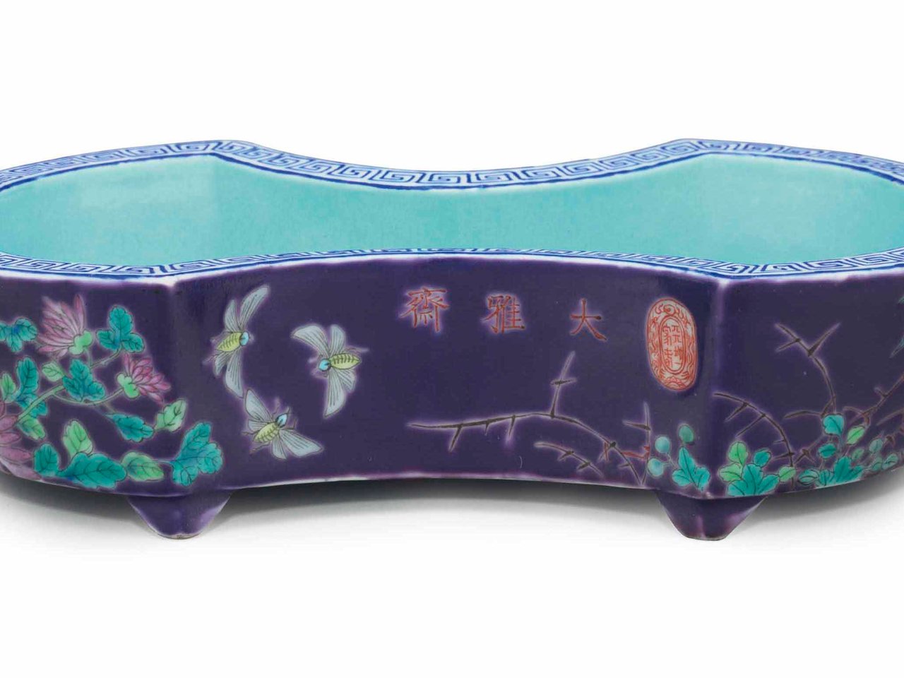 The thick-walled tray is raised on six conical supports and decorated on the exterior in bright enamels on a rich purple ground with three bees in flight amidst stems of yellow autumn kui (huangqiu kui), blue asters and chrysanthemum, as well as inscribed below the rim with the characters, Dayazhai, beside the Tian Di Yi Jia Chun iron-red seal mark. The flat rim is decorated in blue enamel with a band of key fret and the interior is covered in turquoise enamel. The characters Yong Qing Chang Chun ('Eternal Prosperity and Enduring Spring') are inscribed in iron red on the base.