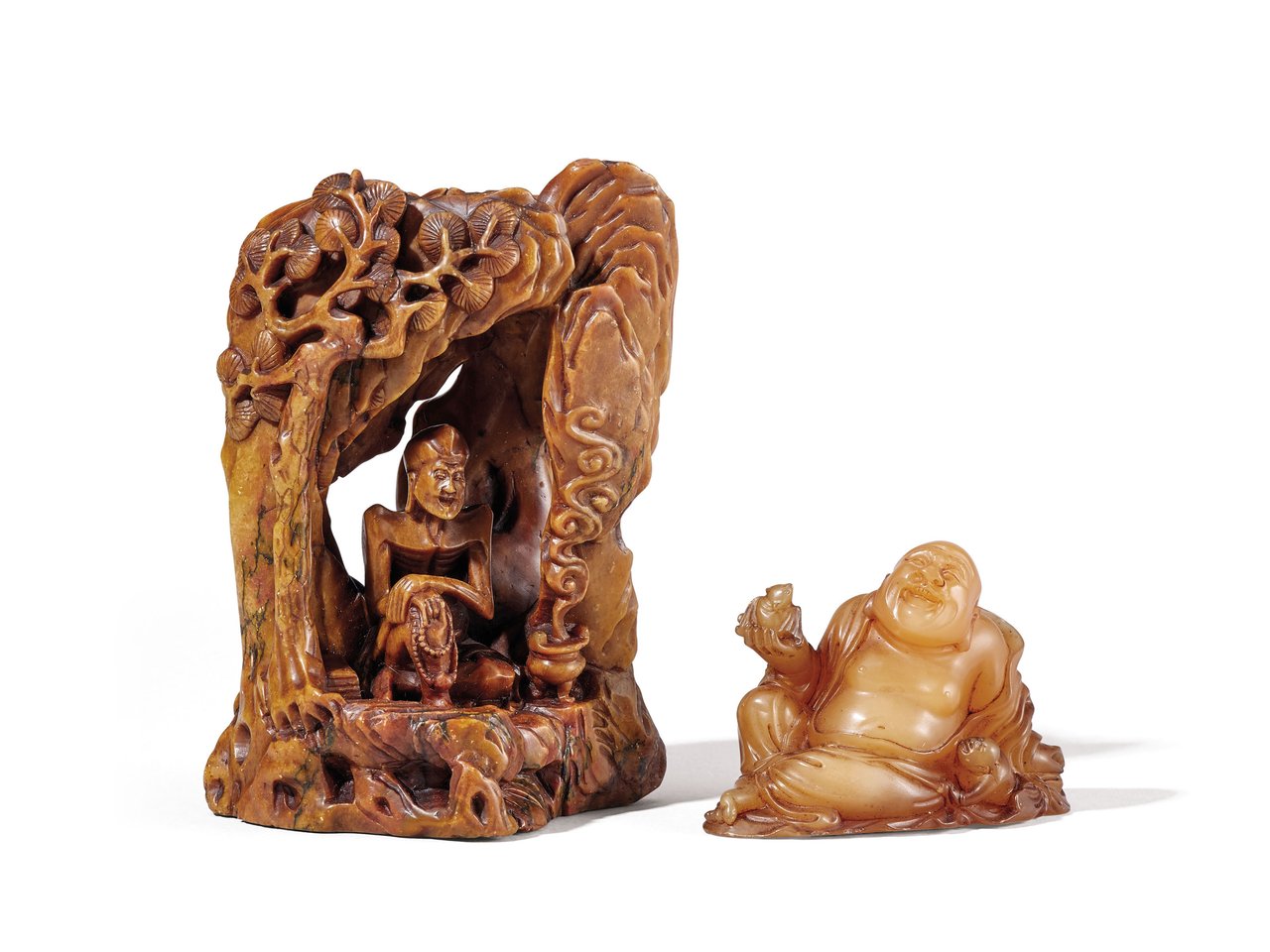 A SOAPSTONE LUOHAN AND GROTTO GROUP AND A SOAPSTONE FIGURE OF A SEATED BUDAI by Anonymous