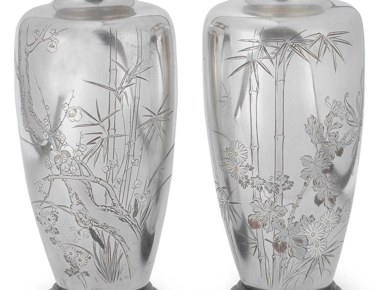 Each vase similarly engraved in katakiribori (engraving with an angled chisel emulating brushstrokes) and kebori (plain line engraving) with a complementary design representing 'The Three Friends of Winter' (shochikubai: pine, prunus and bamboo), one vase decorated with the branches of a plum tree meandering among stems of bamboo, the second vase with chrysanthumums (a mixture of plain and fancy long-petalled varieties) bending against tall stems of bamboo, the stamens of some of the flowers inlaid in gilt, each vase signed on the reverse with chiselled characters Yoshikuni koku and seal Yoshi enclosed within a circular seal and stamped on the base Jungin (Pure silver); with one tomobako, inscribed on the outside Kabin and inside the lid, signed by the artist Shimomura Yoshikuni with seal Hobi, and two separate wood stands. (5).