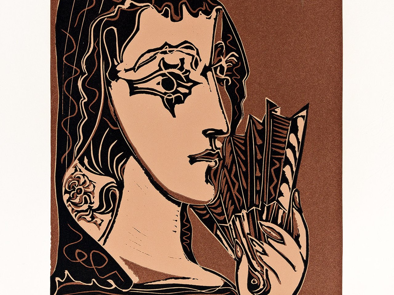 Among the more than 150 color linoleum cuts that Picasso produced during the 1950s and 1960s, none stand out for their boldness of execution and sheer artistry as much as his colorful semi-abstract portraits of his second wife, Jacqueline Roque (1927-1986). Picasso's entry to the medium of color linoleum cut coincided with his introduction to Jacqueline in the early 1950s, he had tried his hand at a few monochromatic linoleum cuts in the 1930s but never pursued the medium any further until the mid 1950s.