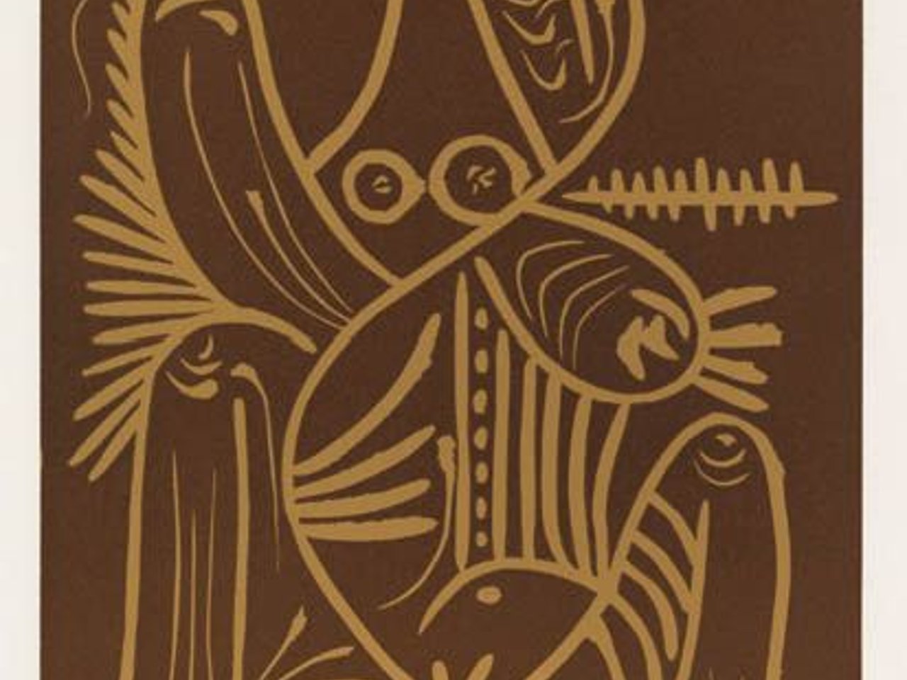 The deluxe edition of 100, with the pencil-signed linoleum cut, from a total edition of 1000. Numbered 58 on the justification page. The color linoleum cut, Femme assise en Pyjama de Plage II , 1961, 390x296 mm; 15 3/8x11 5/8 inches, full margins, signed and numbered 58/100 in pencil, lower margin. Printed by Arnéra, Vallauris. Published by Berggruen, Paris. Original decorated linen portfolios designed by Picasso. Bloch 1062; Baer 1276.