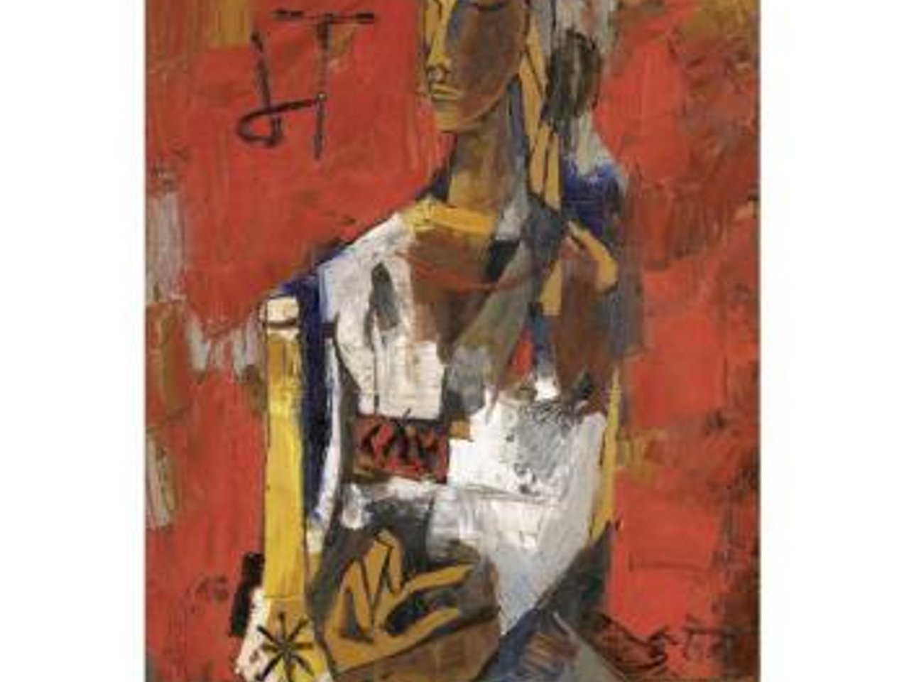 Signed in Devanagari lower right and inscribed, signed and dated ' "Woman in Red"/ Husain/ 1964/ New York no.1' on reverse