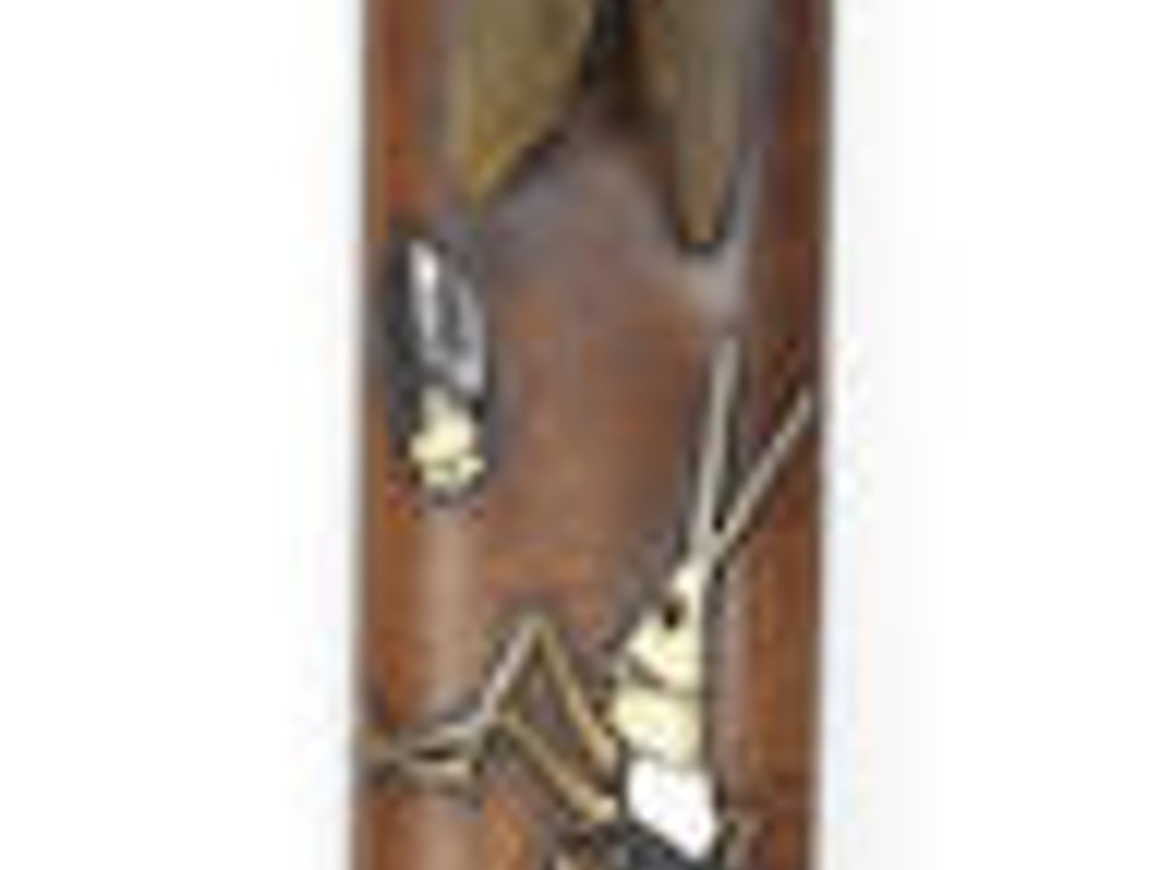 In the form of a tanto (short sword) with a boxwood scabbard, decorated in shell, wood, stained bone and horn relief inlay with various species of insects and amphibians including butterflies, wasps, ladybirds, beetles, the hilt similarly decorated, the kurigata (fitting for the tying cord) in the form of a cicada and black-lacquer kozuka (small knife carried in the scabbard) inlaid with five insects, unsigned; with wood storage box.(2)