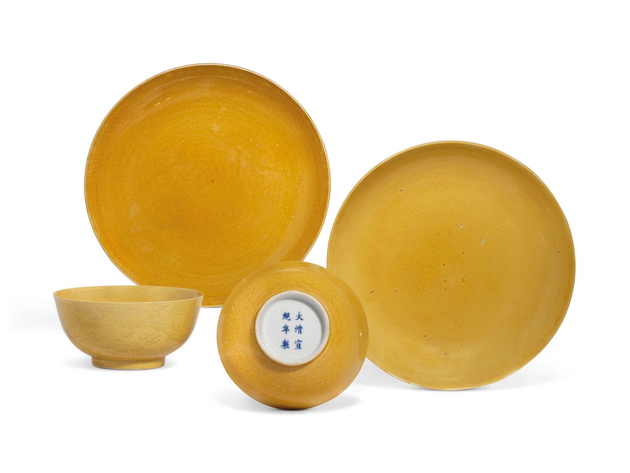 A PAIR OF YELLOW-GLAZED PLATES AND A PAIR OF YELLOW-GLAZED 'DRAGON' BOWLS by Anonymous