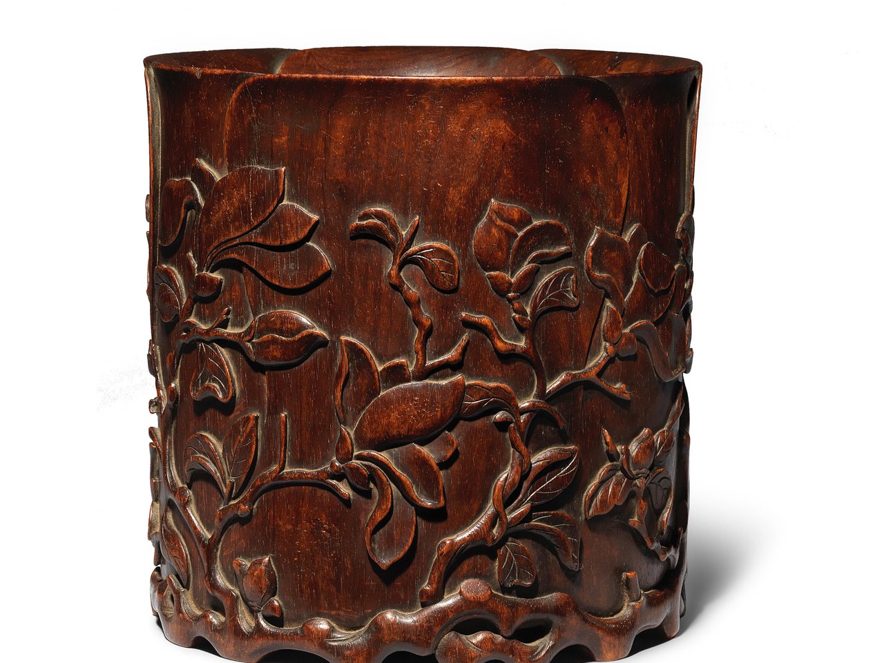 The large naturalistic vessel deftly carved with tall curved walls carved as overlapping magnolia petals, the exterior superbly carved in relief with gnarled branches issuing buds and blossoming magnolia flowers, the wood of warm dark-honey tone.