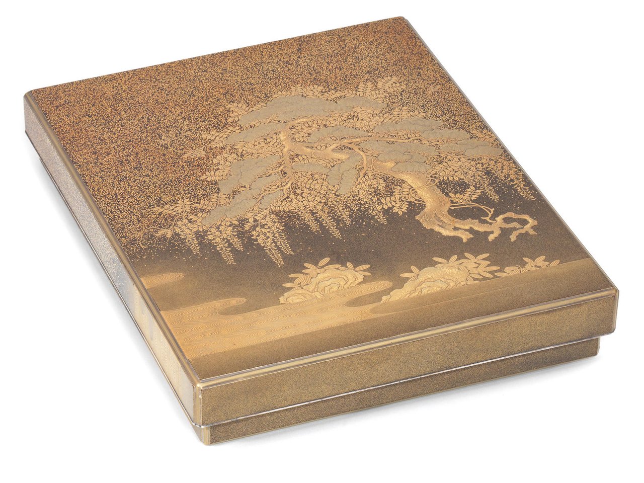 Both decorated in contrasting tones of gold takamaki-e, hiramaki-e and e-nashiji with details executed in kirikane, the decoration as follows on the kabusebuta (overlapping lid) of the suzuribako: a spring scene comprising a pine tree overgrown with wisteria at the water's edge beside which kumazasa (kuma bamboo leaves) grow from behind rocks, the inside of the lid decorated with shrubs of spring plants including tanpopo (dandelions), tsukushi (horsetails), warabi (ferns) and sumire (violets) beneath a dense reddish-orange nashiji ground, the inside of the box similarly lacquered with spring plants and fitted with a removable tray containing the partially gilt and shakudo oval suiteki (water-dropper) and ink-grinding stone, one unrelated gold-lacquered brush and ink-stick holder, signed in gold lacquer Hobi on the fitted tray, the bundai of standard form with fudegaeshi (raised struts to left and right), similarly lacquered in contrasting tones of gold takamaki-e with an autumnal scene depicting a pine and maple tree behind a bamboo fence over which trailing kuzu (kudzu) vines are draped, the top right corner with flowering chrysanthemums and hagi (bushclover) and sasa (bamboo leaves) issuing from rocks at the water's edge, with details executed in sprinkling of fine kinpun, the sides mounted with silvered-metal fittings engraved with foliate scrolls, with lacquered-wood storage boxes, the lids of each inscribed with the artist's name and description of the contents Shunju maki-e on-suzuribako Hobi (Maki-e box for writing utensils with spring and autumn design by Hobi) and Shunju maki-e on-bundai Hobi (Maki-e writing desk with spring and autumn design by Hobi),