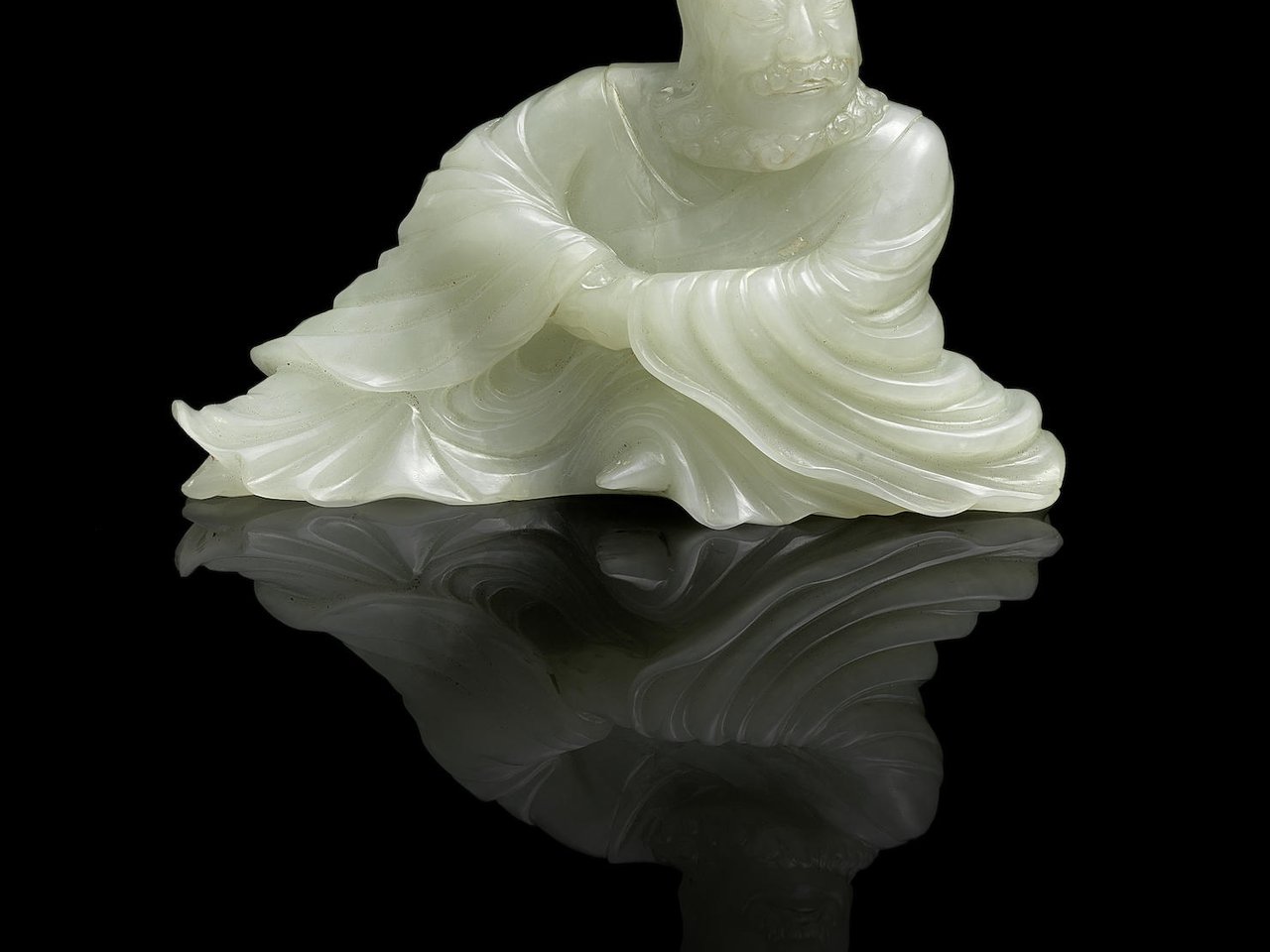 Crisply carved as a recumbent luohan probably Bodhidharma, the thick folds of the robe falling from his broad shoulders revealing just his hands tucked into his sleeves as well as his feet at the hem, the intense expression of contemplation highlighted by his furrowed brow, fierce curling moustache and beard beneath his bald head, wood stand and box. (3)