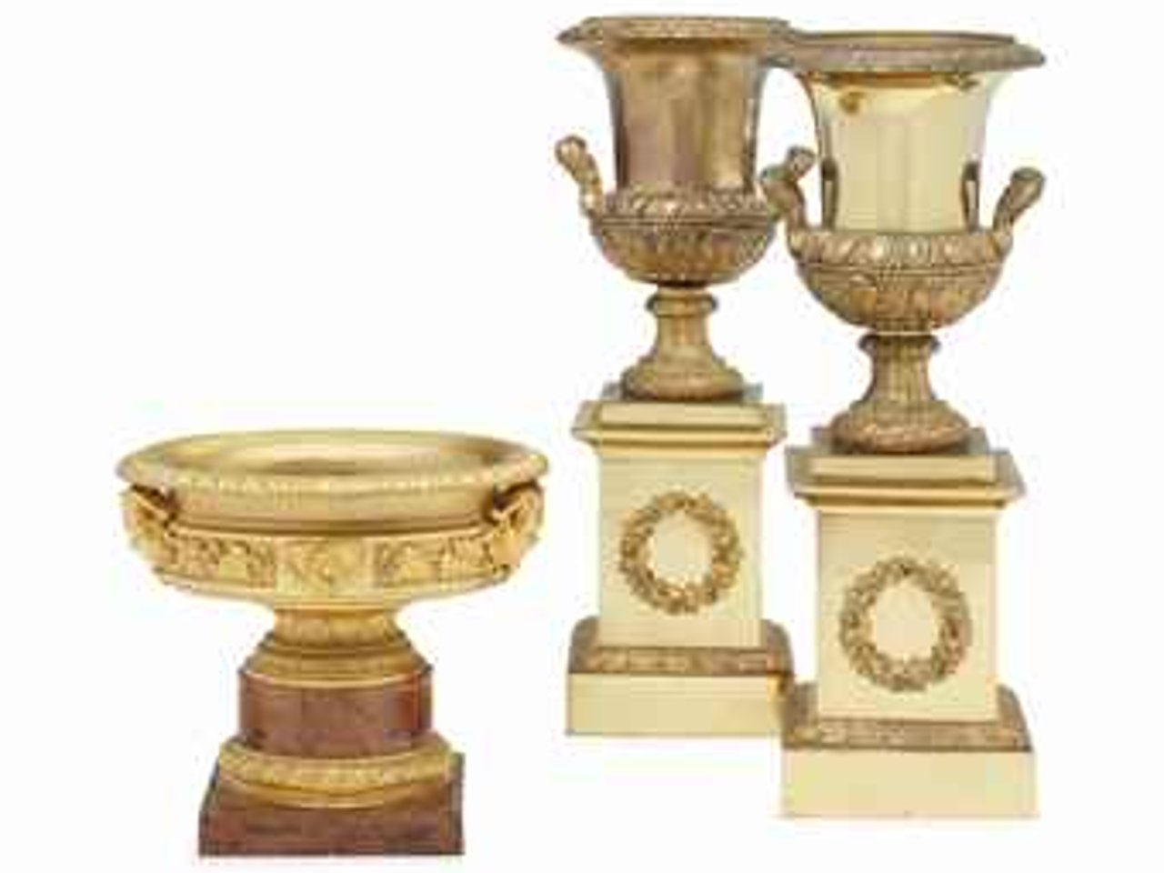 Together with a Napoleon III ormolu oval urn on peach-figured marble base<br/> 19th century