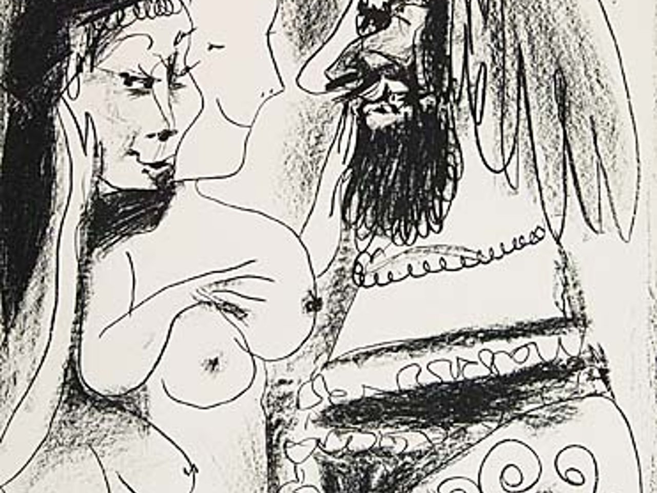Le Vieux Roi , 1959. 655x503 mm; 253/4x197/8 inches, full margins. Edition of 1000. With the stamped signature, lower right * Le Picador II , printed in colors, 1961. 200x260 mm; 77/8x101/4 inches, wide margins. Published by André Sauret, Monte Carlo. From A los Toreros avec Picasso . Both good impressions. Bloch 869 and 1017; Mourlot 317 and 350; Reuße 748 and 788.