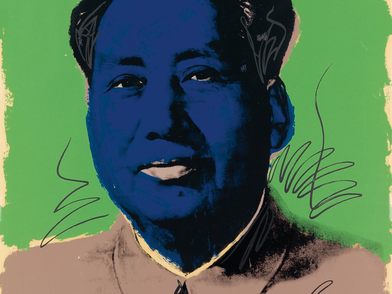 Warhol (1928-1987) created the 10 different color screenprint portraits of Chinese Chairman Mao Zedong (1893-1976) following Richard Nixon's historic visit in China in 1972. He addressed the cult of personality surrounding China's renowned Premier using his signature portrait style previously reserved for mass-produced consumer products and Hollywood film stars. Famously blending the propaganda utilized to render modern totalitarian rulers and the liveliness of American, western media, these garishly colored, graffiti-like portraits of Mao helped propel Warhol toward international Pop icon status. Feldman 90.