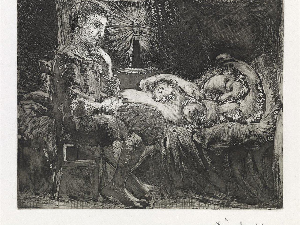 This print, however, portrays a tranquil scene of a sleeping woman (Marie-Thérèse); her fertile feminine features illuminated by candlelight, with a young man (likely intended to symbolize Picasso himself) sitting and thoughtfully watching her at rest. A single candle illuminating the scene creates a stillness and chiaroscuro reminiscent of Rembrandt's nocturnal scenes.