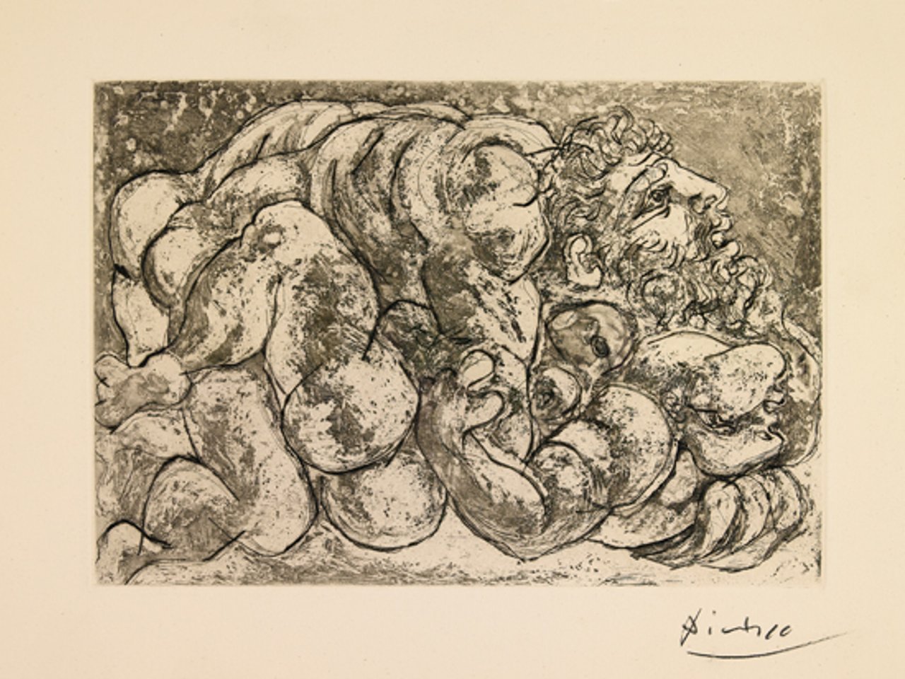 Etching and aquatint, 1933. 198x278 mm; 7 5/8x11 inches, full margins. Edition of 260. Signed in pencil, lower right. Picasso watermark. Printed by Lacourière, Paris. Published by Vollard, Paris. A very good, well-inked and dark impression. Bloch 181; Geiser 340 Bd.