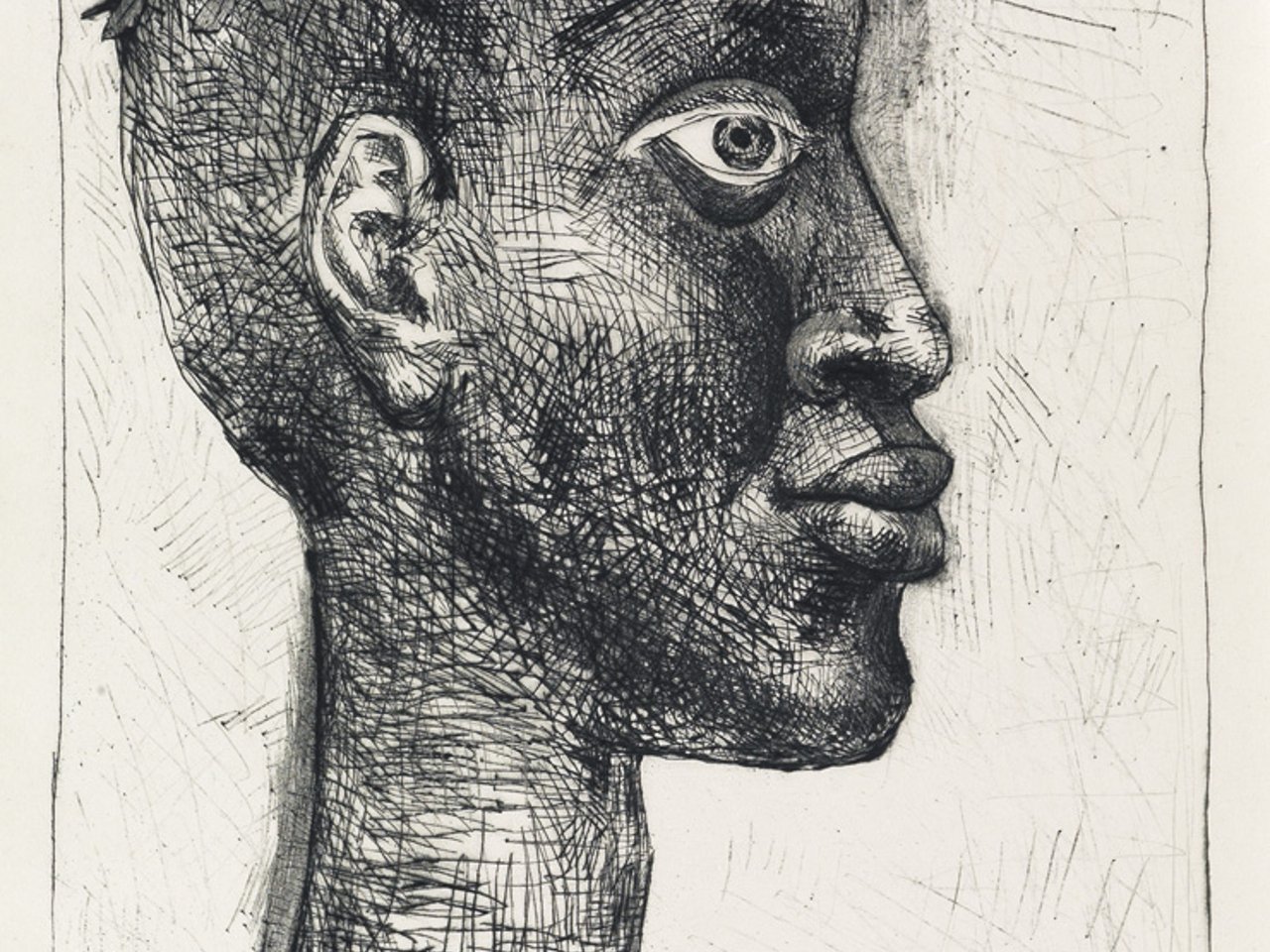 Picasso's frontispiece portrait of Césaire (1913-2008) as a laurel-crowned poet laureate. Césaire, the Parisian (via Martinique) central figure of the négritude movement in Francophone literature during the 1930s, met Picasso in 1948 at the Communist-led World Congress of Intellectuals for Peace, in Wroclaw, Poland. They connected on their shared interest in Communist politics and African art. Picasso and Césaire collaborated on Corps Perdu in 1949-50. Picasso's 32 drypoints and etchings for the work, many fusing male and female sexual organs with plant-inspired forms, illustrate Césaire's text which explores society's brutal positing of the black man as half-human, half-beast. Bloch 633; Baer 841 Bd 2.