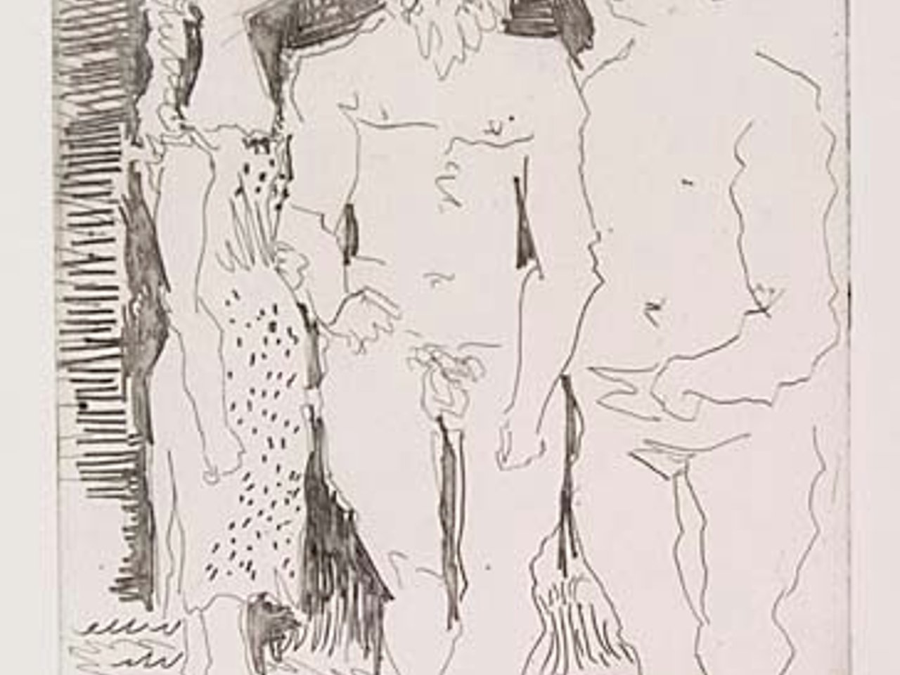The influence of Rembrandt's graphic work appears significantly for the first time in Picasso's Vollard Suite , a series of 100 etchings executed in the early 1930s and named for the publisher Ambroise Vollard. Picasso adopted imagery from Rembrandt's prints intermittently through his mid-career and the old master's influence is again seen strongly from around 1960 onward. Picasso's admiration for Rembrandt in particular and other earlier masters, such as Delacroix and Manet, bordered on competition. Regarding Delcaroix's " Les Femmes d'Alger ," a subject which occupied Picasso in early 1955, he stated, "That bastard. He's really good" (Viejo/Cohen, Etched on the Memory, The Presence of Rembrandt in the Prints of Goya and Picasso , Amsterdam, 2000, p. 80). Similarly, he said, "When I see Manet's " Déjeuner sur l'Herbe " I say to myself: trouble in store," (Viejo/Cohen, p. 80). In 1944, when reviewing with François Gilot the etchings he had made for the Vollard suite in the previous decade, he commented, "Every painter takes himself for Rembrandt. Everbody has the same delusions," (Viejo/Cohen, p. 81). Bloch 984; Baer 1069.