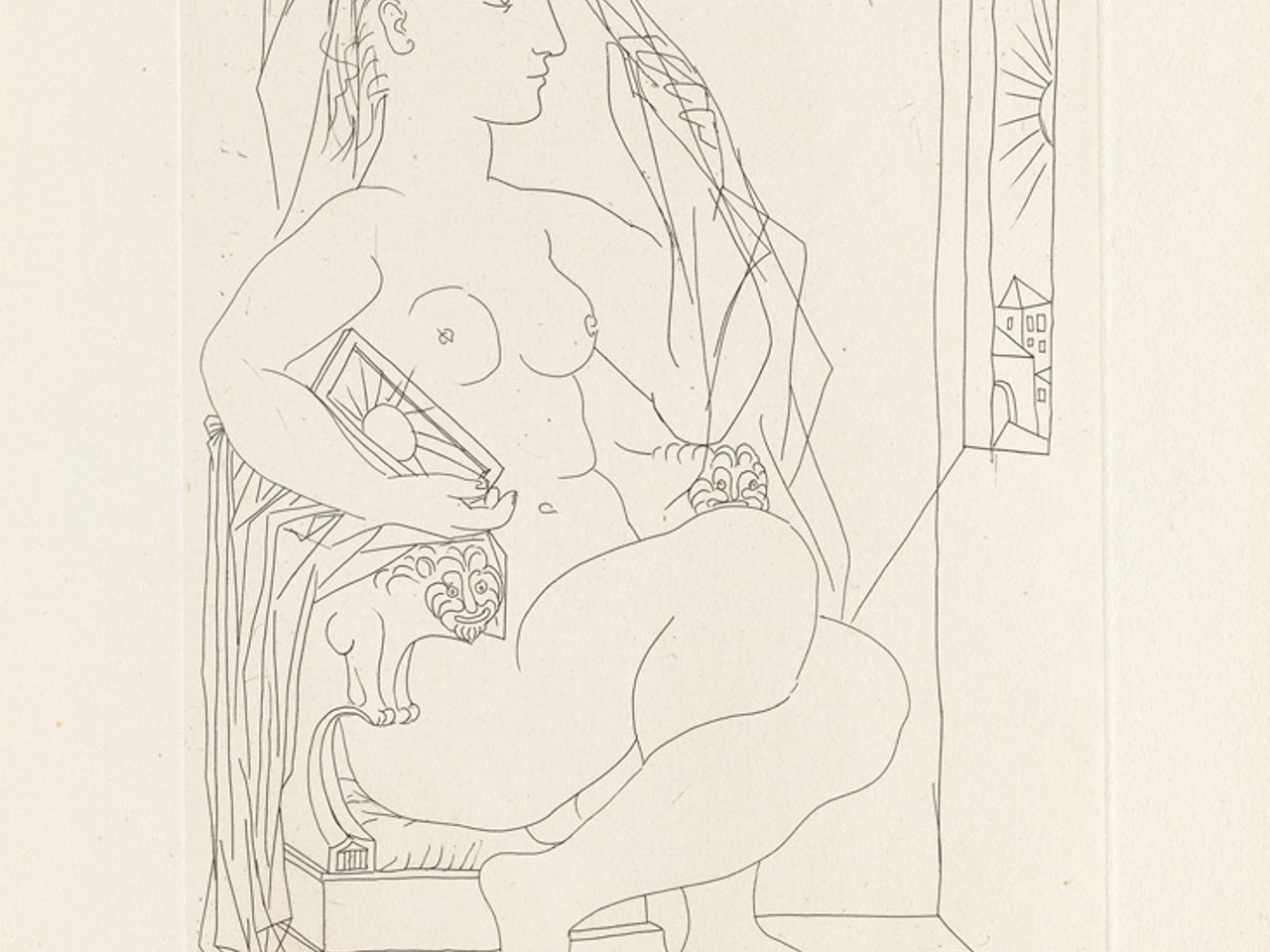 Etching on cream laid Montval paper, 1934. 275x197 mm; 10 3/4x7 3/4, full margins. One of only a few impressions on this paper (with either a Picasso or Vollard watermark) before steel-facing and aside from the unsigned edition of 55 from the steel-faced plate. Signed, dated "Paris le 27 Avril 1942" and dedicated "pour Frélaut" in pencil, lower right. Picasso watermark. A superb impression of this extremely scarce etching.