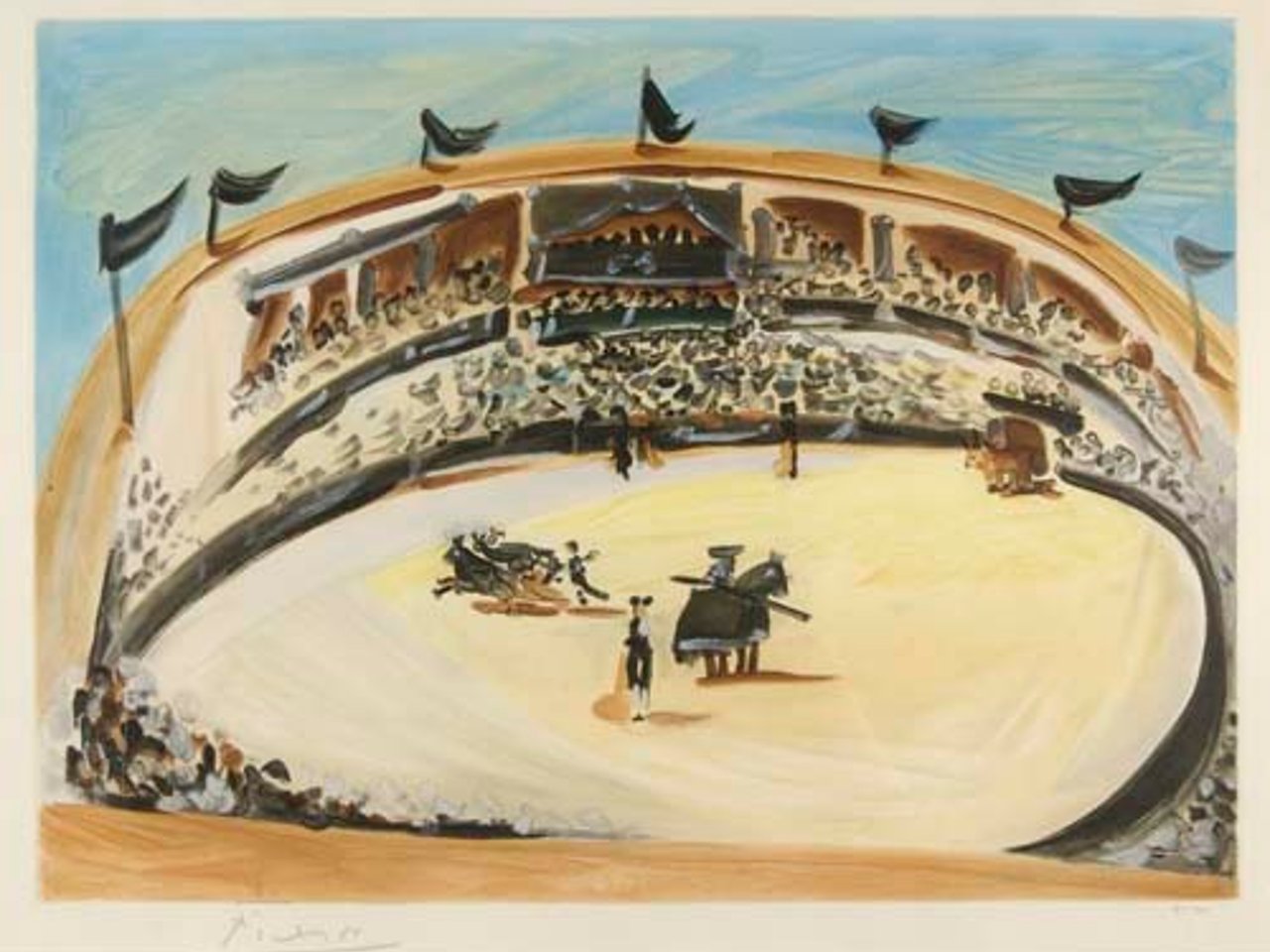 Color aquatint, 1956. 485x655 mm; 191/8x253/4 inches, full margins. Signed and numbered 80/200 in pencil, lower margin. Printed by Crommelynck, Paris. A very good impression of this large color print.