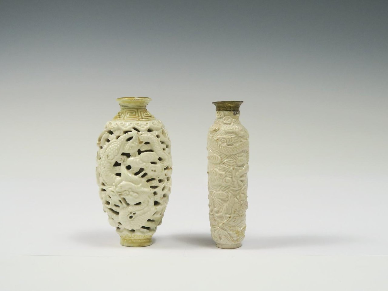 The first of double walled construction, relief modelled with a dragon to one side and phoenix to the other on a pierced cloud design background, Jiaqing seal mark and of the period, 7.5cm high, the other a soft paste example relief moulded all over with a pair of dragons within clouds, probably early 19th century, 6.5cm high and with metallic applied rim