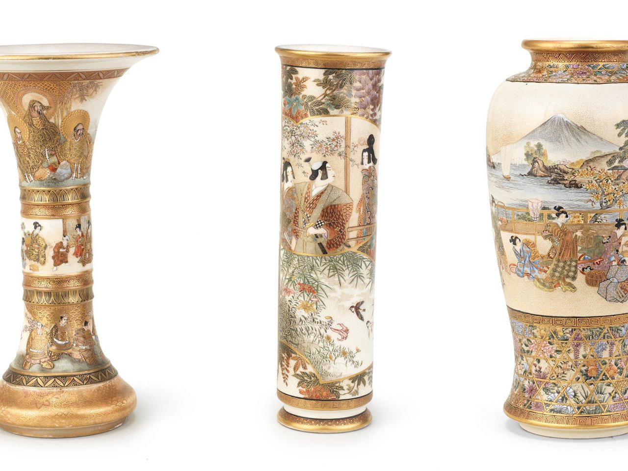 Each decorated in enamels and gilt, the first a baluster vase with a continuous band enclosing a feast scene from the Nisemurasaki showing a 'false' Prince Genji regaled by several attendants from a restaurant bringing trays of delicacies, between bands of seasonal blooms growing from behind a latticed fence, signed on the base Kizan kore o tsukuru, ; the second a slender cylindrical vase with three lobed panels depicting a wakashu flanked by two courtesans above sparrows flying towards flowering lilies and bamboo, the third panel enclosing an outdoor scene of a wealthy family enjoying momijimi (maple-viewing), signed on the base Kyoto Tojiki Goshigaisha within a seal above a gilt signature Ryozan, ; the third a trumpet-shape vase with bands of rakan, a middle-class family in an interior, and warriors discussing battle tactics in front of a jinmaku (war curtain), ; the last a bowl decorated with a profusion of dense blooms of peony, morning glory and chrysanthemums extending over the exterior, stopping short of the foot, signed on the base Hotoda, ; with a wood stand. (5).