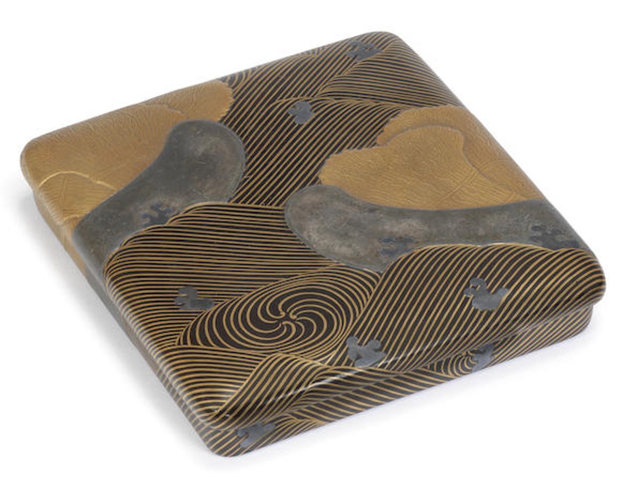A rounded-rectangular suzuribako (writing box) with kabusebuta (overhanging lid), in the form associated with lacquers in the Rinpa style, including curved sides and distinctive interior layout with suzuri (ink stone) and suiteki (water-dropper) to the left and slot for knife or brush to the right, the exterior and interior decorated in gold hiramaki-e and takamaki-e and pewter inlay, the exterior with a Rinpa-style design of billowing waves and shibafune (rafts laden with brushwood), the interior with waves in gold hiramaki-e swirling around mitsudomoe (three-comma) motifs in pewter inlay, the suzuri with a gold-lacquer rim, the rectangular suiteki of gilt-copper alloy, the base plain black lacquer, inscribed underneath the suzuri with gold hiramaki-e characters Seisei Korin; double wooden tomobako storage box, the outer box inscribed outside Ogata Korin saku Uji no shibafune maki-e on-suzuribako suzurishita zaimei (Writing box with lacquer design of brushwood rafts at Uji by Ogata Korin, signed underneath the ink stone); inscribed inside by the renowned collector Masuda Don'o (Takashi, 1848-1938) Suzuribako ga shibafune wagaie no juho Seisei Korin sei saku [...] hinoe-tora nigatsu Masuda Don'o kore o shirusu (Writing box with design of brushwood rafts by Seisei Korin, recorded by Masuda Don'o in February 1926); the interior of the inner box with further inscriptions and two decorative papers, one of them inscribed with the poem by Priest Jakuren on which the box's design is based (see below). (6)