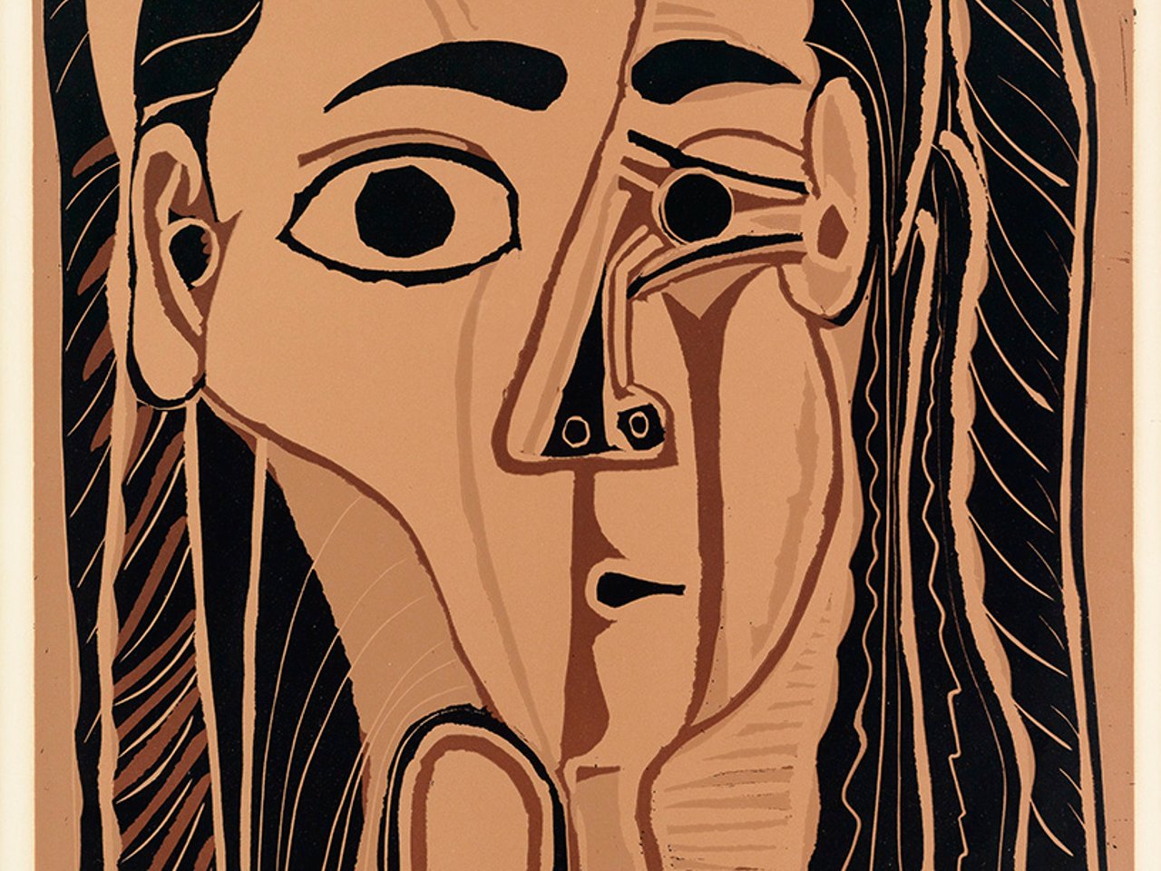 Among the more than 150 color linoleum cuts that Picasso produced during the 1950s and 1960s, none stand out for their boldness of execution and sheer artistry more than the colorful, semi-abstract portraits of his second wife, Jacqueline Roque (1927-1986). Picasso's entry to the medium of color linoleum cut coincided with his introduction to Jacqueline in the early 1950s; he had tried his hand at a few monochromatic linoleum cuts in the 1930s but never pursued the medium any further until the mid 1950s.