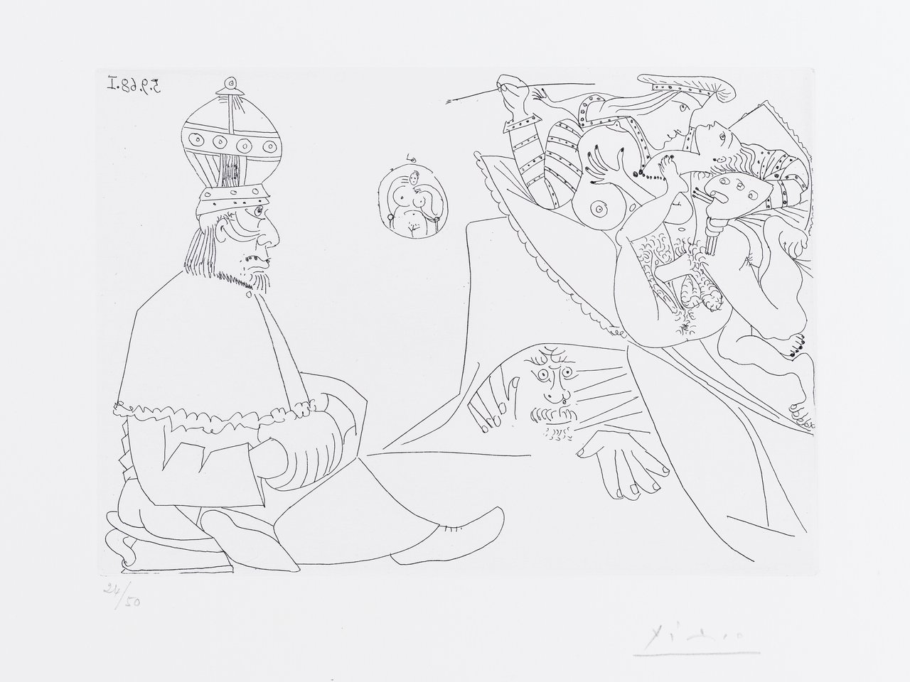 Raphaël et la Fornarina. XIX: Pape sur son pot, avec tiare et manchon; Michel-Ange est caché sous le lit by Pablo Picasso