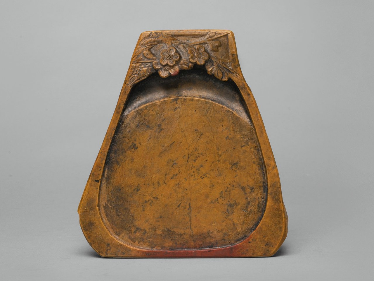 of trapezoidal shape, the smooth grinding surface decorated at the top with a prunus bough issuing leaves and blossoms, the stone a dark yellow tinged with red, Japanese paper cover (2)