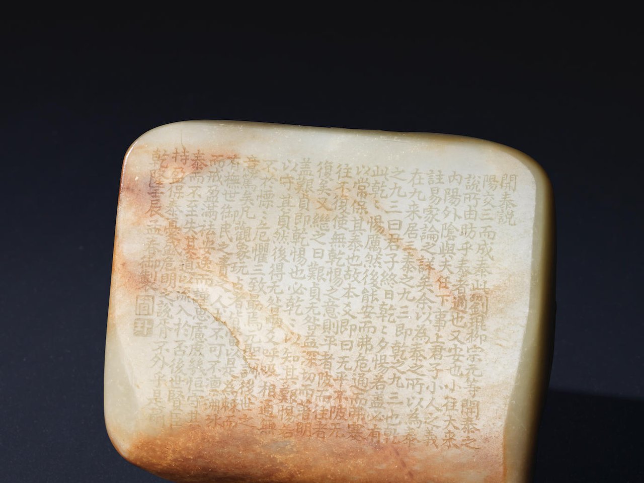 A rare Imperially-inscribed pale green and russet jade 'three rams' plaque