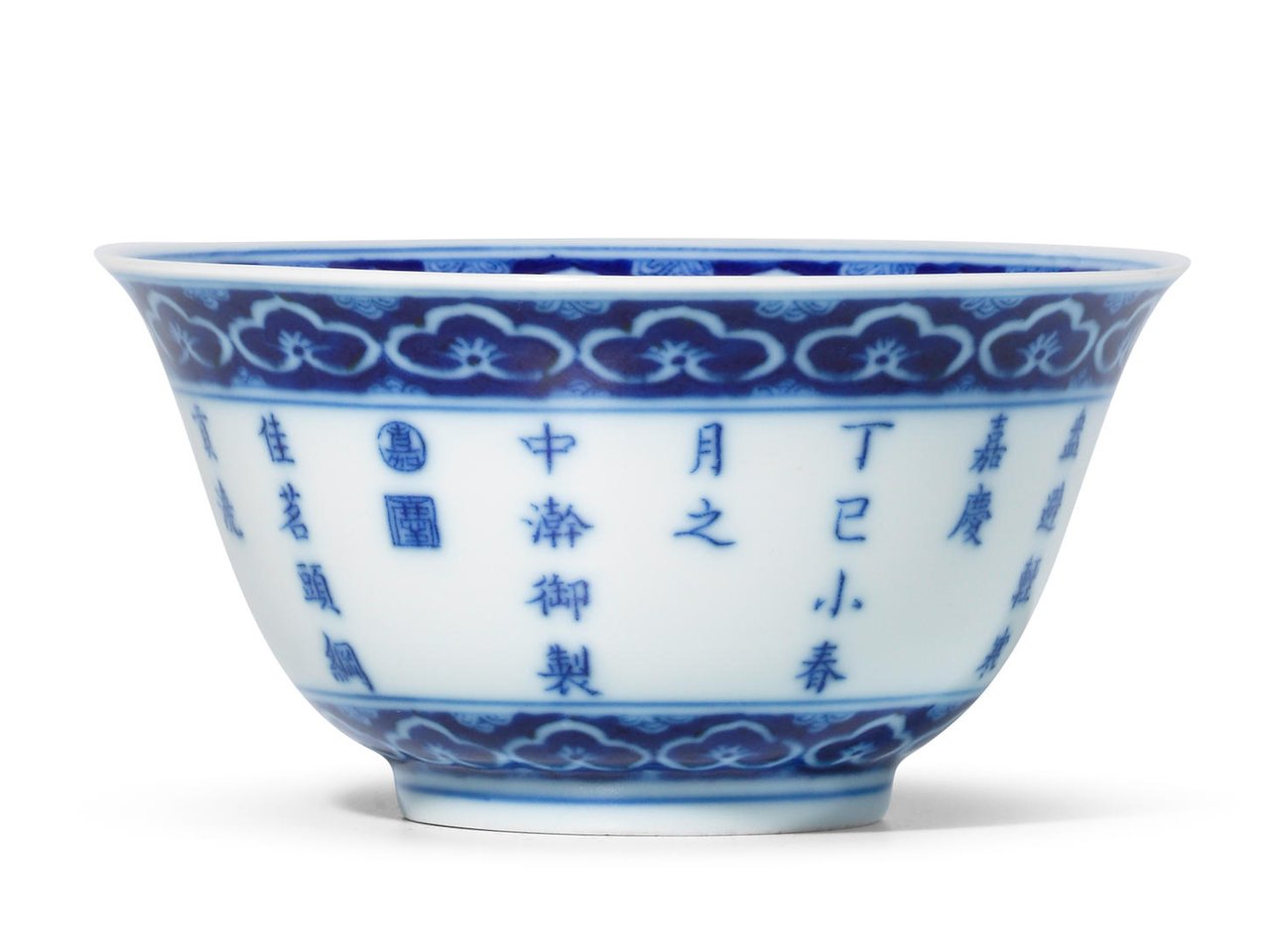 Delicately painted in brilliant tones of cobalt blue at the central medallion with gnarled branches of finger citron, pine and plum blossoms, encircled by a ruyi-head border reserved on blue ground with a further similar band below the rim, the exterior inscribed with a poem composed by the Jiaqing Emperor written in kaishu, dated to dingsi year of the Jiaqing's reign with two mock seals of Jia Qing, enclosed by two ruyi-head borders, box. (2).