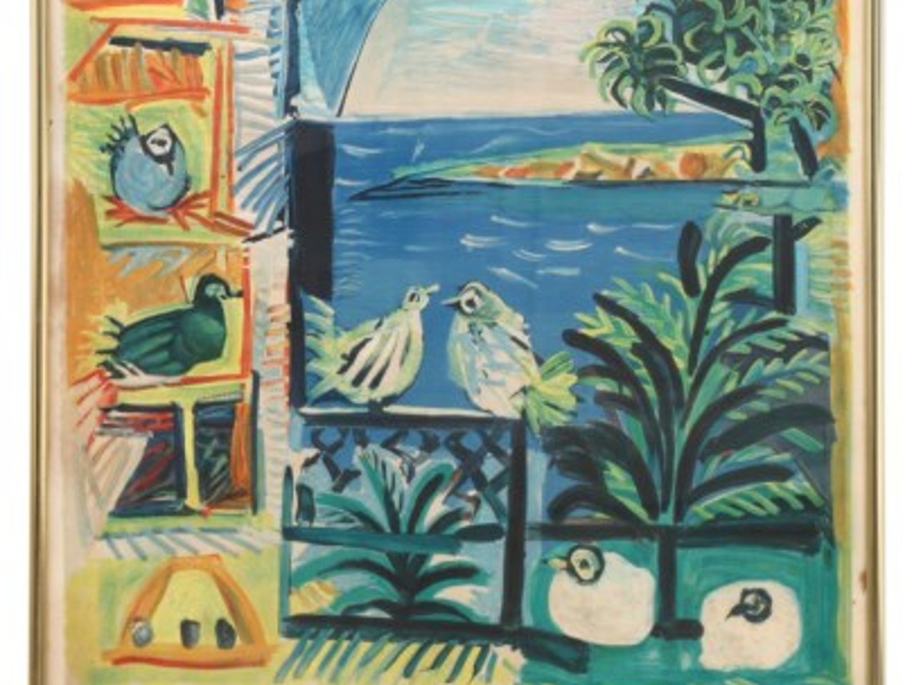 c.1961 " Cote d" Azur" travel poster, lithograph by "Henri Deschamps", plate signed "Picasso"; lower text reads "Ministere des Travaux Publics et des Transports, Commissariat General au Tourisme, Printed in France, Published by and for the French Government: Ed. 61-23 - Imp. Mourlot, Paris". 39 x 25.75 inches - Frame: 40 x 27 inches. Weight: 13.5 lbs.