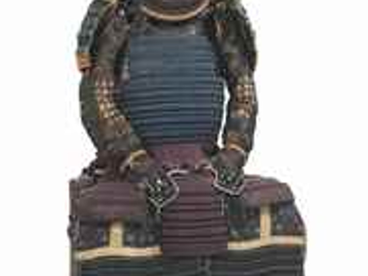 Cuirass [nimai-do]: the two-piece cuirass of blue kebiki odoshi (close lacing) of alternate black lacquered iron and leather hon kozane (individual scales), the munaita (upper breast section) and ushiro tate-age (upper back section) together with the waki-ita (under-arm pieces) and the watagami (shoulder strap) of shittsuke-zane (sheet iron in simulation of hon-kozane), manchiru (mantle - shoulder covering) blue brigandine