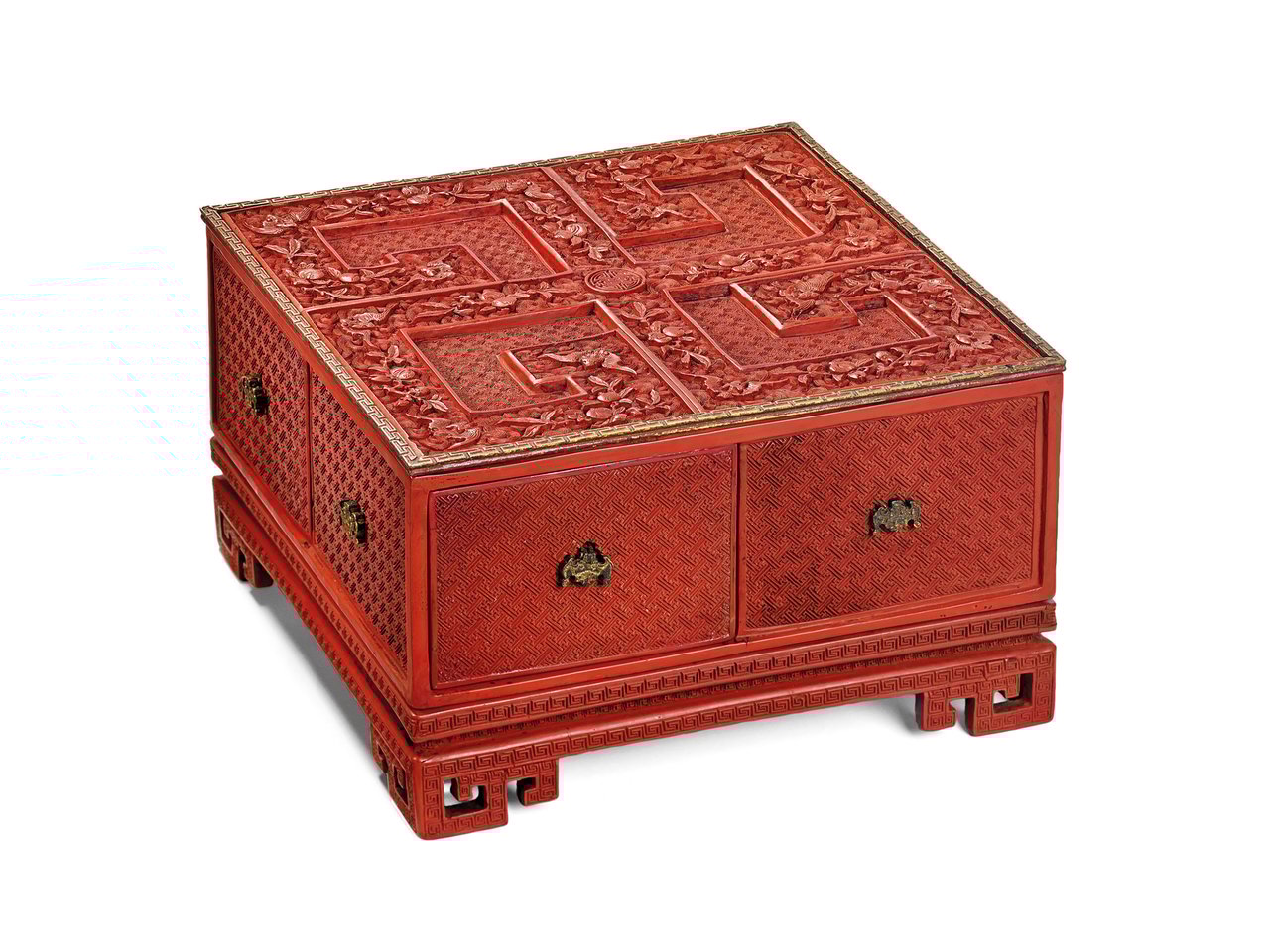 The square box is carved on the top with a wan symbol centred with a shou roundel. The black-bordered angular key-fret pattern is carved with the Eight Daoist Emblems amidst bats and shou plaques on a diaper-ground. Each of the four sides of the box with two diaper-ground panels centred with gilt-metal handles shaped as bats, each right-hand panel opening to reveal a drawer. All raised on a separate square stand with key-fret borders and scroll feet at the corners.