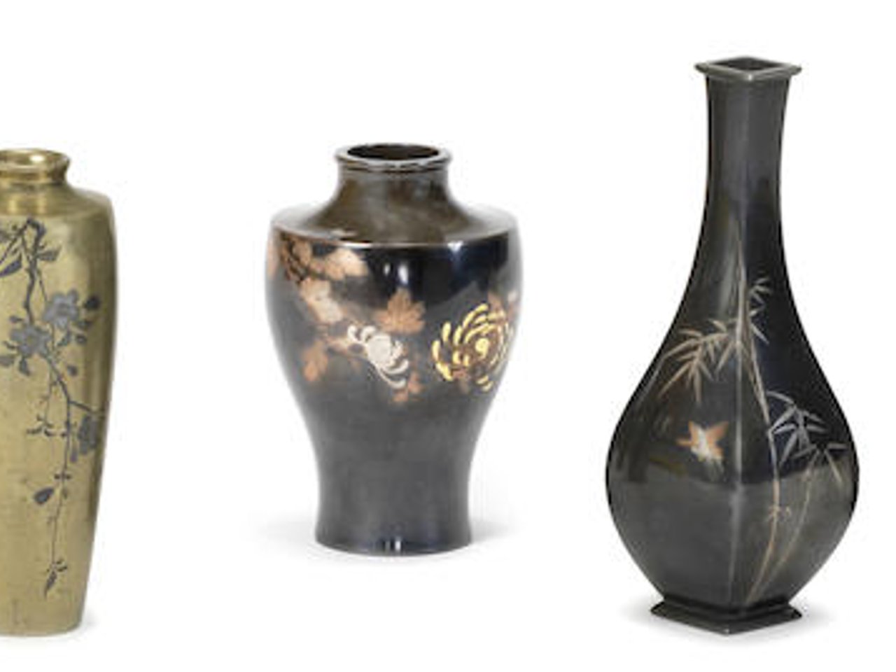 Comprising two pairs and a single vase, all worked in flat inaly of various metals, the first pair of square baluster form, one vase depicting a butterfly hovering over stalks of lilies, shukaido (hardy begonia), and a heron wading beside reeds, the other depicting a sparrow and a butterfly hovering among chrysanthemums and bamboo, both vases signed on the side Yoshimasa and on the base with the mark of the Nogawa Company; the second ovoid pair of vases with an almost identical design of trailing branches of cherry blossoms, both signed Mitsukiyo koku on the side and on the base with the mark of the Nogawa Company, each vase; the last vase with a single stalk of chrysanthemums draping from the shoulder across the body, the base signed with mark of the Nogawa Company,